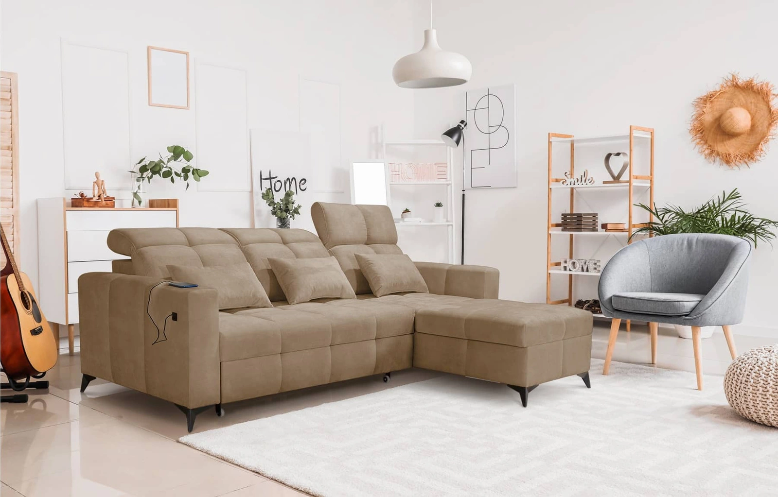 Mezi doplňky tohoto nábytku, které ocení všichni uživatelé, patří kontejner na lůžkoviny, nastavitelné opěrky hlavy a nabíjecí zásuvka USB v boční části rohové skříně.