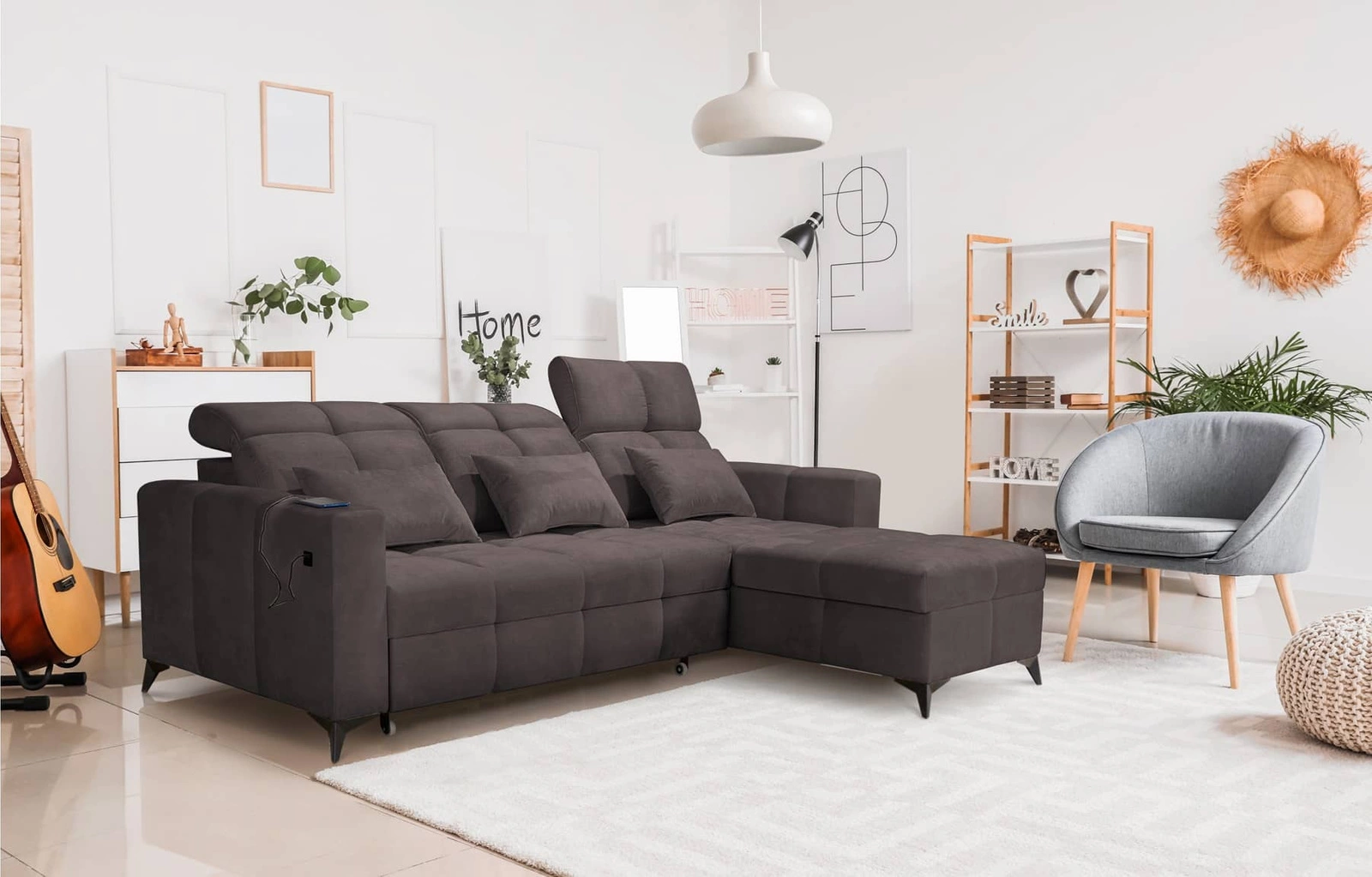 Mezi doplňky tohoto nábytku, které ocení všichni uživatelé, patří kontejner na lůžkoviny, nastavitelné opěrky hlavy a nabíjecí zásuvka USB v boční části rohové skříně.