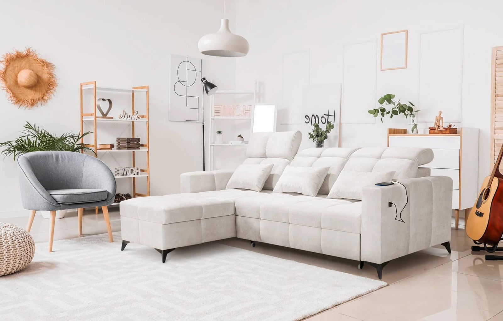 Mezi doplňky tohoto nábytku, které ocení všichni uživatelé, patří kontejner na lůžkoviny, nastavitelné opěrky hlavy a nabíjecí zásuvka USB v boční části rohové skříně.