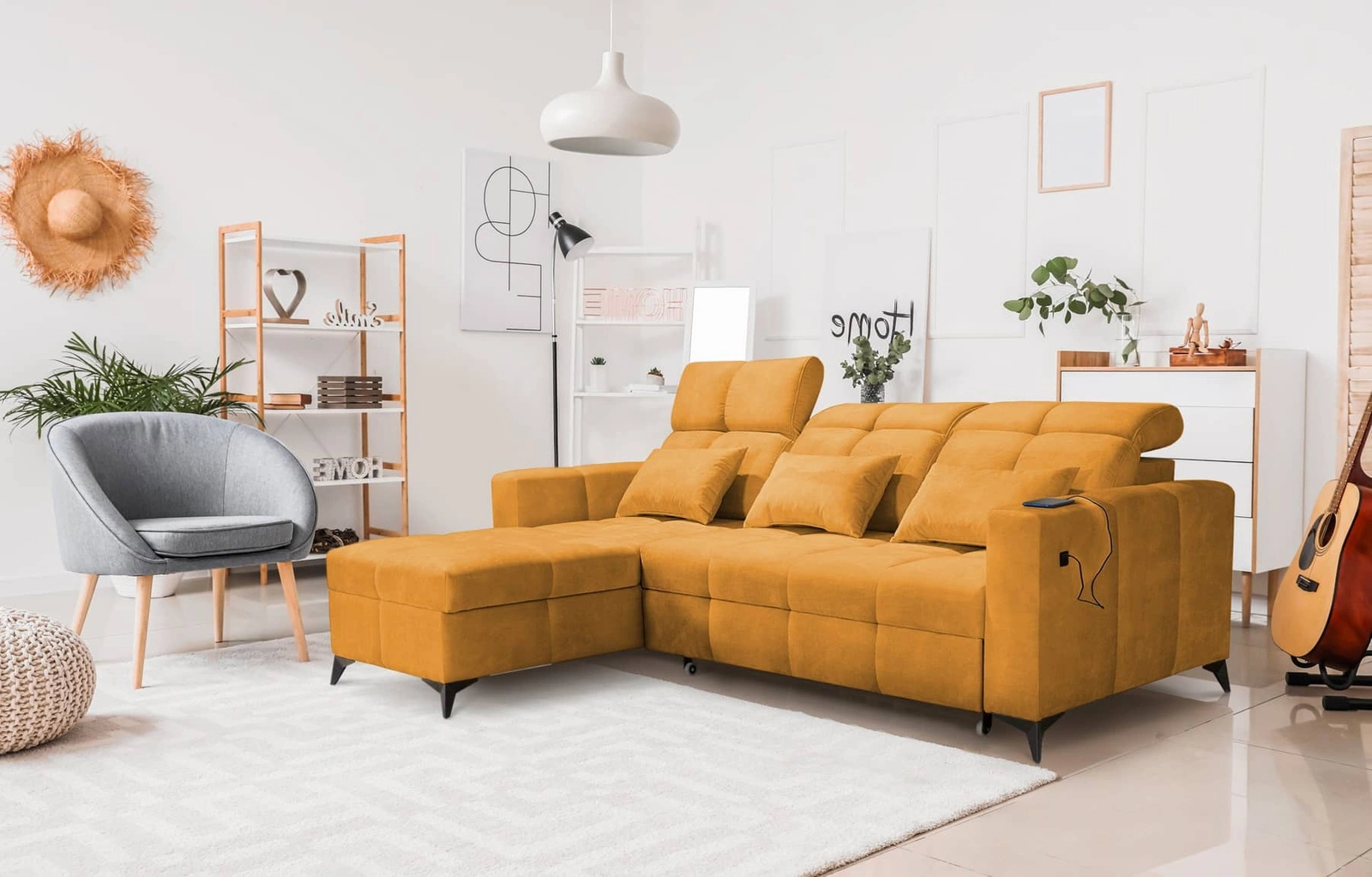 Rohová pohovka Laredo ve žluté barvě s nastavitelnými opěrkami hlavy je zajímavě vypadající kus nábytku s elegantním povrchem.