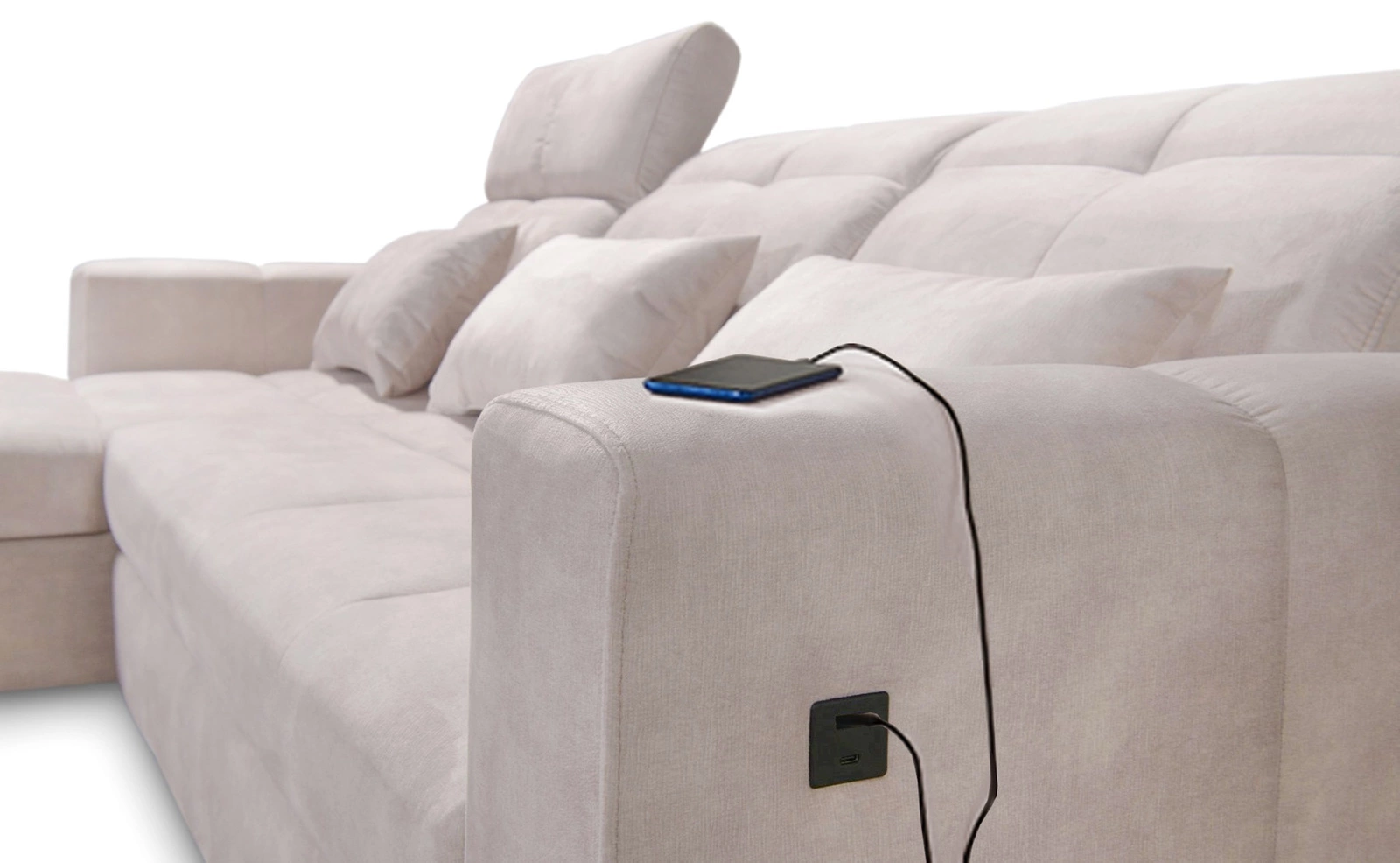 Mezi doplňky tohoto nábytku, které ocení všichni uživatelé, patří kontejner na lůžkoviny, nastavitelné opěrky hlavy a nabíjecí zásuvka USB v boční části rohové skříně.