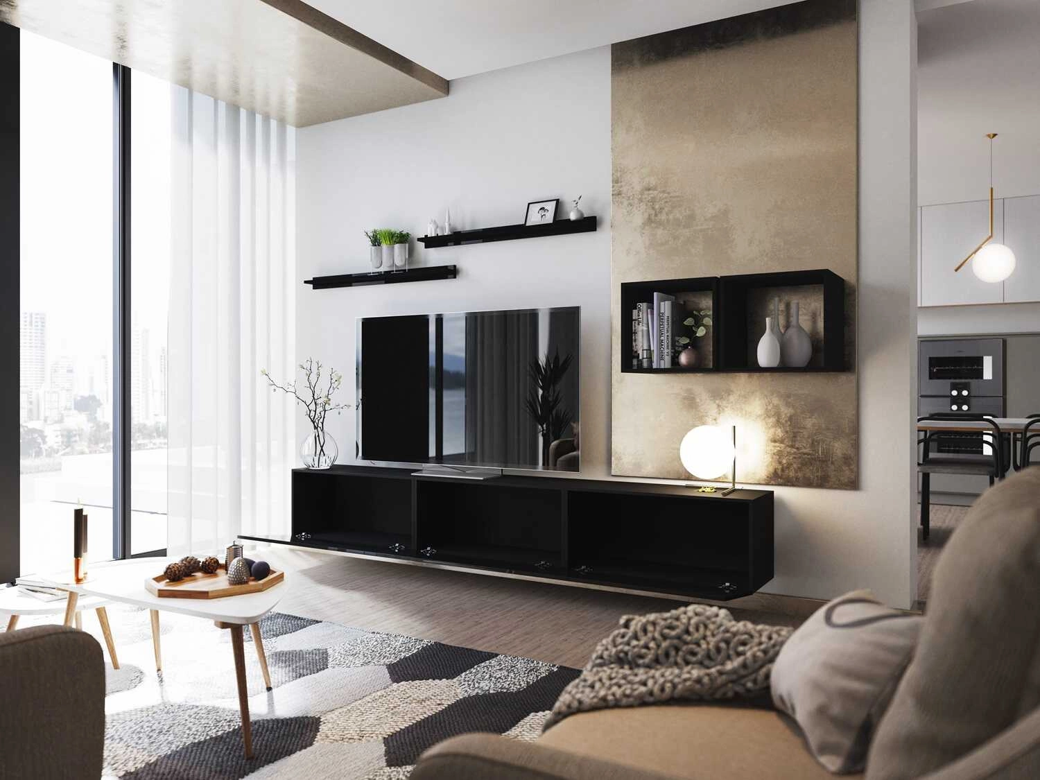 Závěsné police pro vystavení dekorací do obývacího pokoje. Prostorné skříně RTV pojme veškeré příslušenství a vybavení. Další výhoda skříně RTV je možnost volby způsobu jejího umístění. Skříň RTV lze zavěsit na zeď. Díky možnosti zakoupení dalších nohou skříň RTV může velmi rychle se může stát stojícím kusem nábytku.