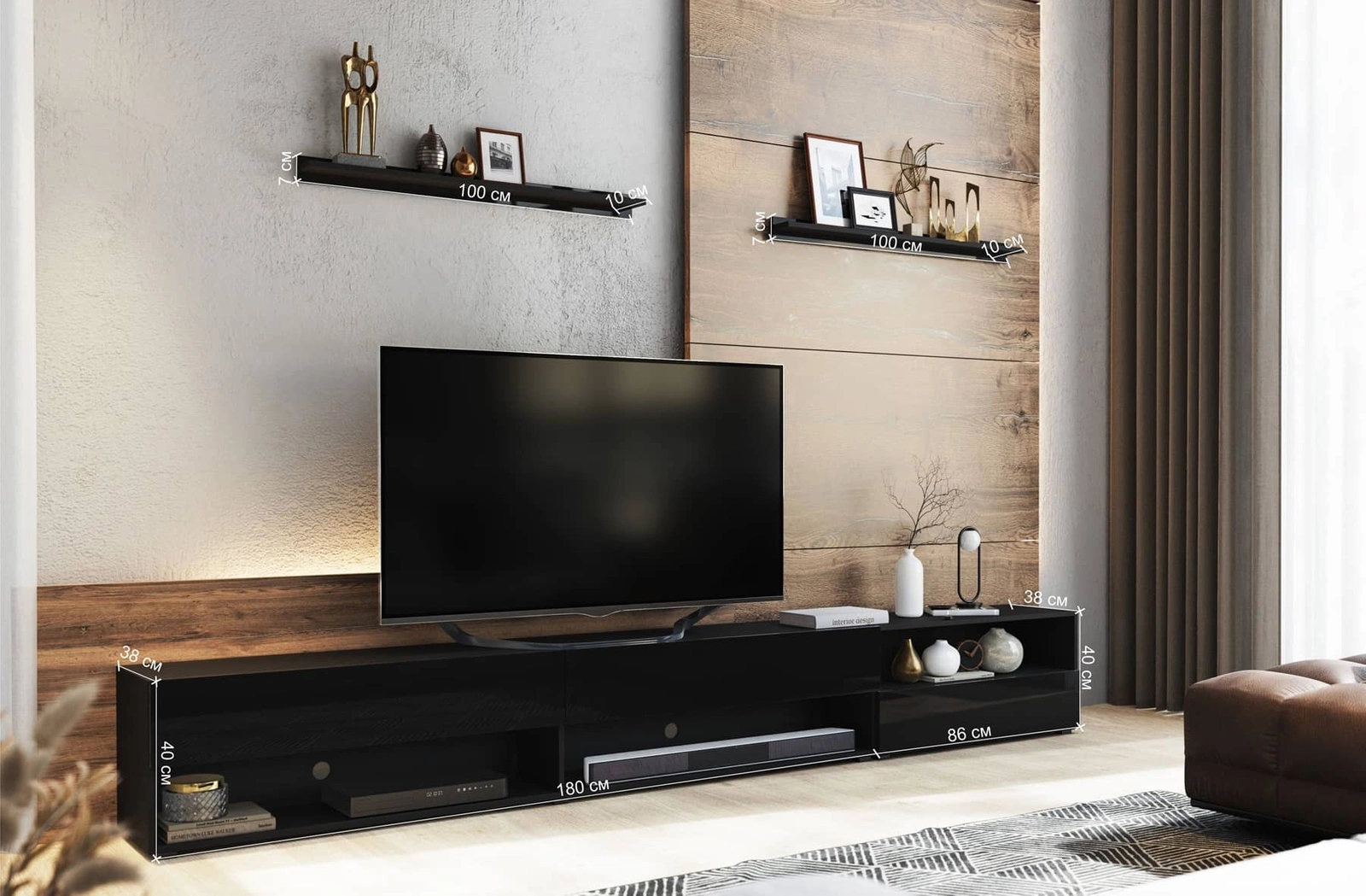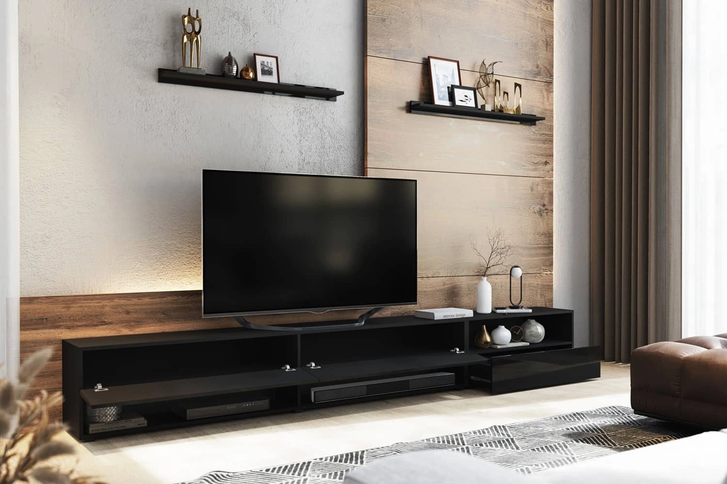 Lawrio 266 cm černá / lesklá černá RTV skříňka se závěsem a policemi stylový design, který se hodí do každého interiéru