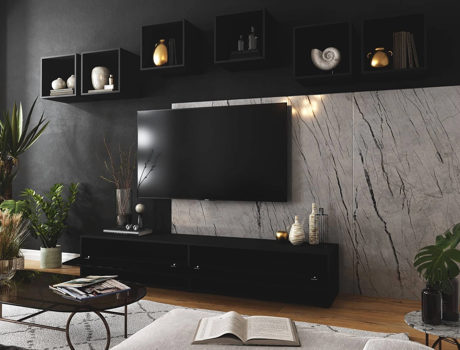 Korpus každé pevné látky byl vyroben z vysoce kvalitní laminovaná deska tloušťka 16 mm, která je odolná vůči vnějším vlivům, jako jsou otlaky, nárazy a nešťastné škrábance. Čela skříněk RTV z MDF desek, potažená fólií lesklý. Dveře skříně RTV se otevírají směrem dolů. Pro otevírání dvířek skříňky s televizorem je nutné použít bezúchytkový systém push-to-open. Kultovní černá pevné látky nábytek se dobře kombinuje s jinými barvami, díky čemuž se nábytek Lindos skvěle hodí pro dobře funguje lze použít jako nástěnnou skříňku do obývacího pokoje nebo jako nástěnnou skříňku do obývacího pokoje.