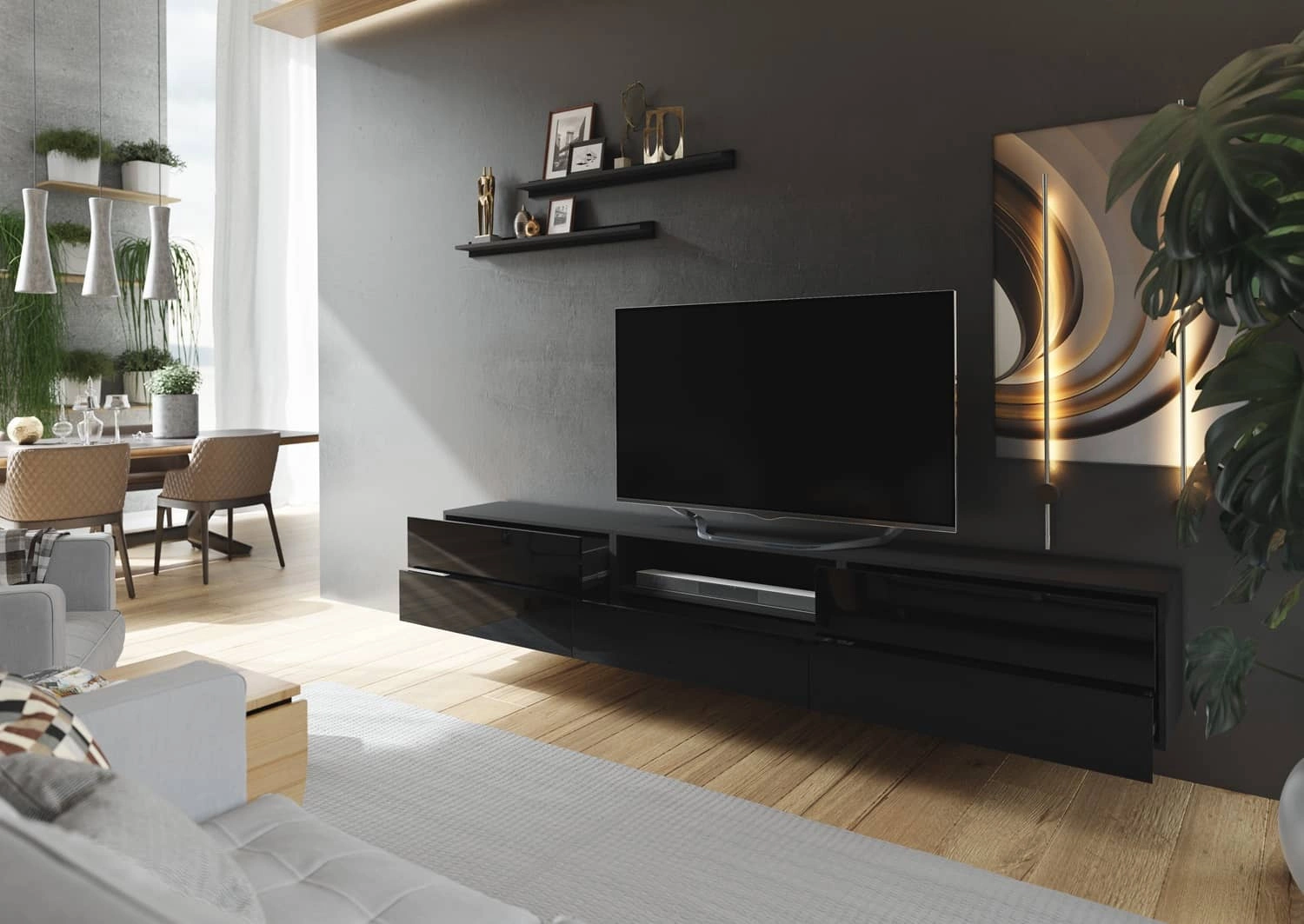 Závěsná RTV skříňka Lutra 258 cm černá / lesklá černá s policemi stylová designová TV skříňka s vysoce lesklými čely