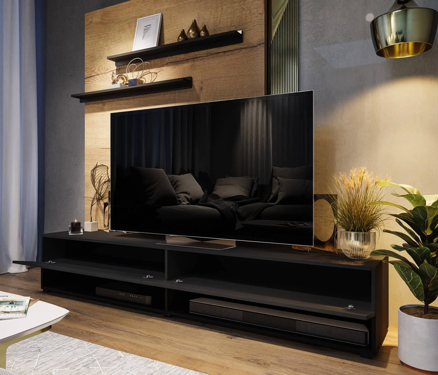 Nábytek na TV Nea o délce 180 cm je výjimečný kus nábytku, který určitě upoutá pozornost v každém moderním interiéru. Jej černý, lesklý čelní panel dodává eleganci a luxusní charakter, zároveň skvěle ladí s ostatními prvky vybavení. Nábytek TV je vybavena praktickými policemi, které umožňují uložení elektronických zařízení a dalších příslušenství, udržujíce pořádek v obývacím pokoji. Možnost zavěšení skříně na stěnu poskytuje větší volnost při aranžování, umožňuje ji přizpůsobit různorodým prostorám.