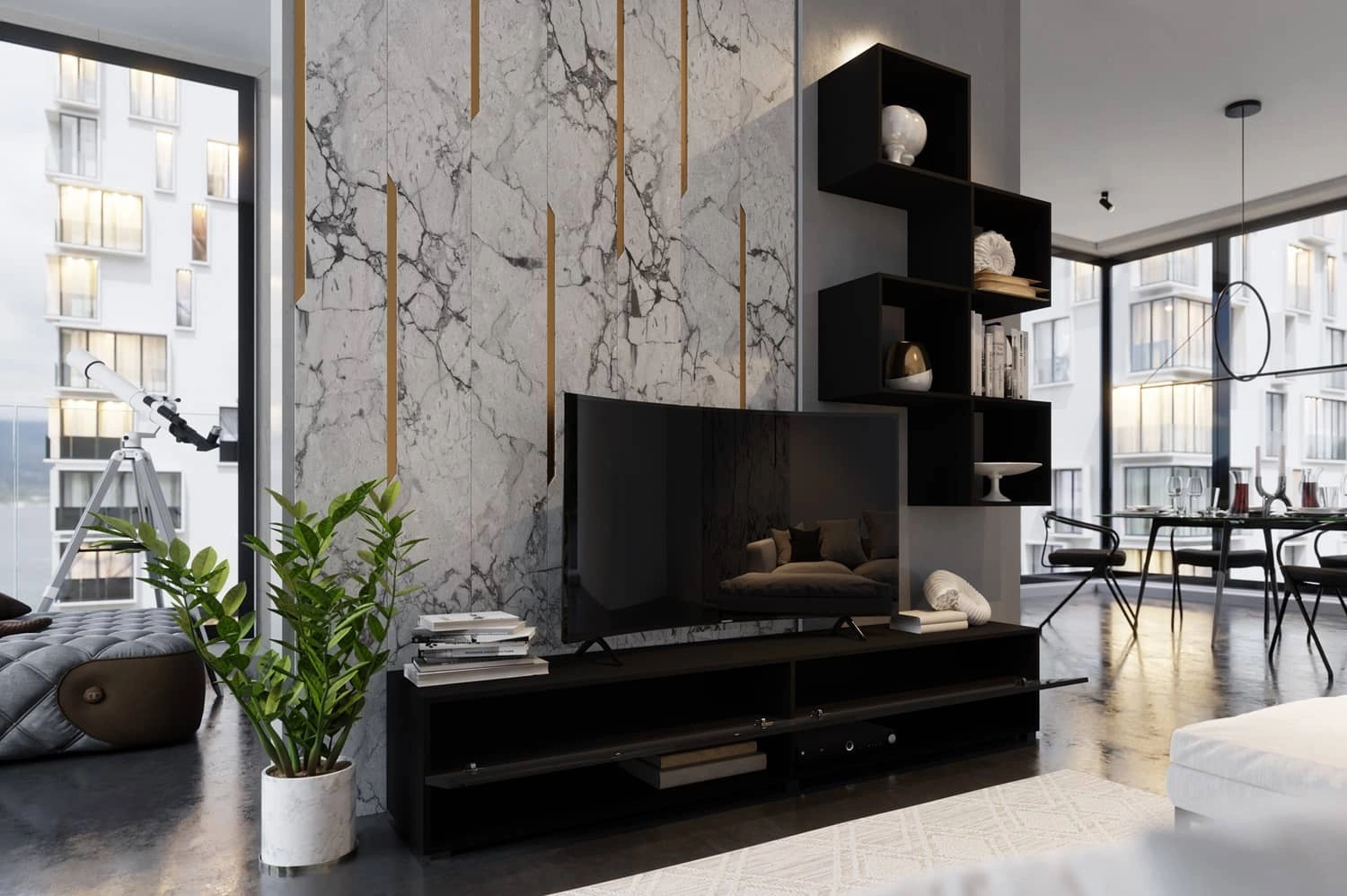 Korpus každé pevné látky byl vyroben z vysoce kvalitní laminovaná deska tloušťka 16 mm, která je odolná vůči vnějším vlivům, jako jsou otlaky, nárazy a nešťastné škrábance. Čela skříněk RTV z MDF desek, potažená fólií lesklý. Dveře skříně RTV se otevírají směrem dolů. Pro otevírání dvířek skříňky s televizorem je nutné použít bezúchytkový systém push-to-open. Kultovní černá pevné látky se dobře kombinuje s ostatními barvami, takže nábytek Nestorio je skvělým řešením pro dokázat lze použít jako nástěnnou skříňku do obývacího pokoje nebo jako nástěnnou skříňku do obývacího pokoje.