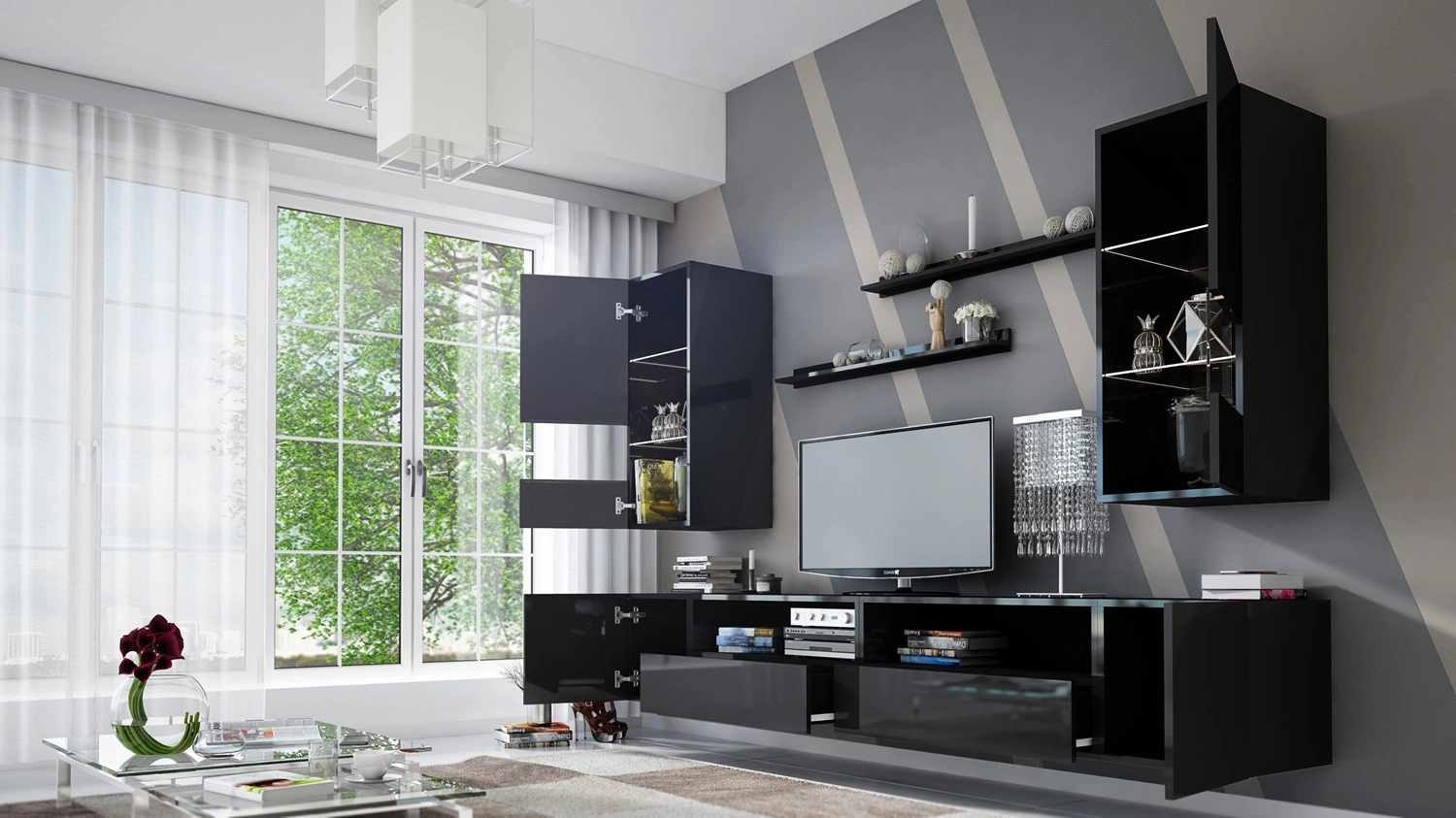 Univerzální nástěnná skříňka Parga černá / černý lesk do obývacího pokoje s lehkým designem se skvěle hodí do každého interiéru