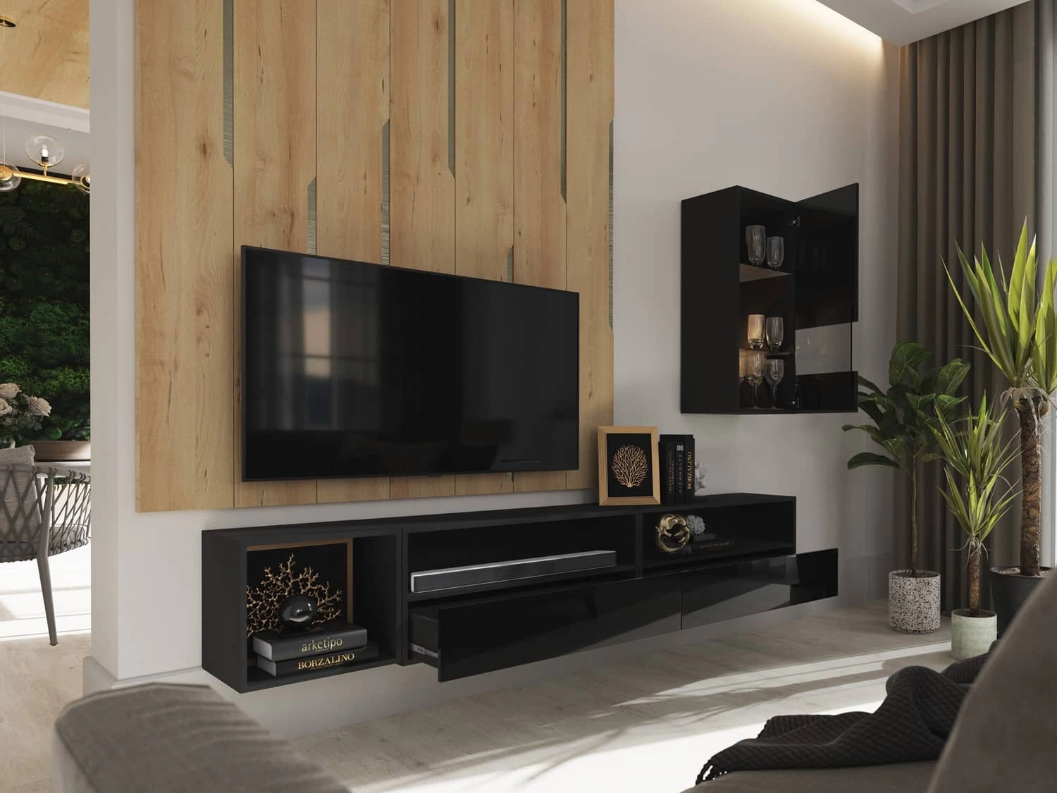 Paleo černá / černý lesk Minimalistický design nástěnné skříňky do obývacího pokoje nebo zasedací místnosti Systém push to open