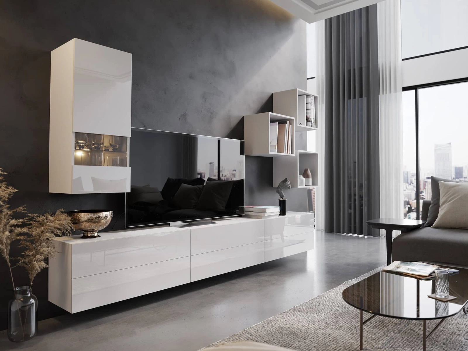 Nástěnná skříňka Peritia bílá / bílý lesk Minimalistický design nástěnné skříňky pro obývací pokoj nebo zasedací místnost Systém push to open