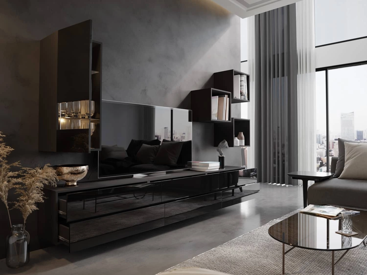 Nástěnná skříňka Peritia černá / černý lesk Minimalistický design nástěnné skříňky pro obývací pokoj nebo zasedací místnost Systém push to open