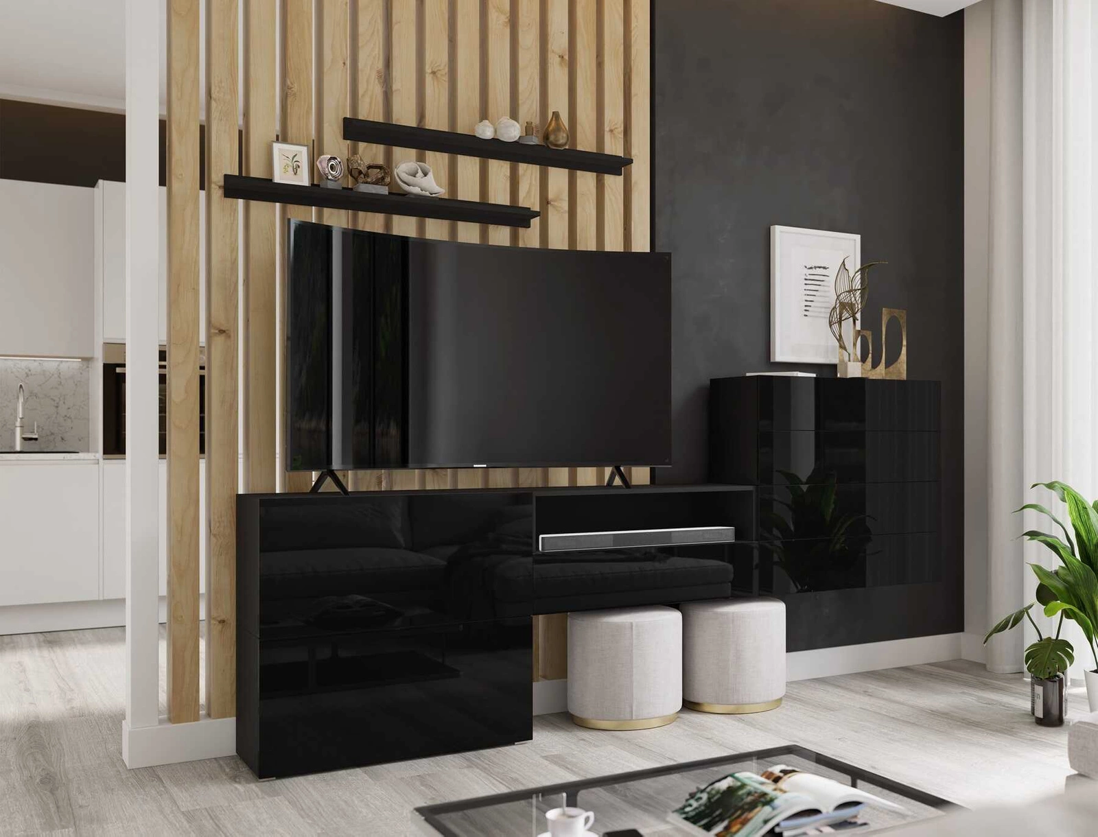 Nábytková stěna Agria černá / černý lesk mimořádný design praktické řešení ideální pro každý obývací pokoj opticky zvětšuje interiér