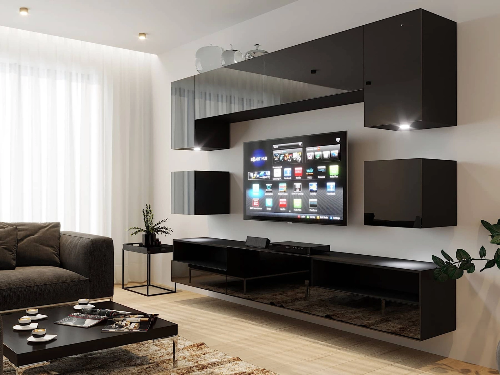 Siana černá / lesklá černá extrémně stylová nástěnná skříňka do obývacího pokoje vizuálně atraktivní a funkční