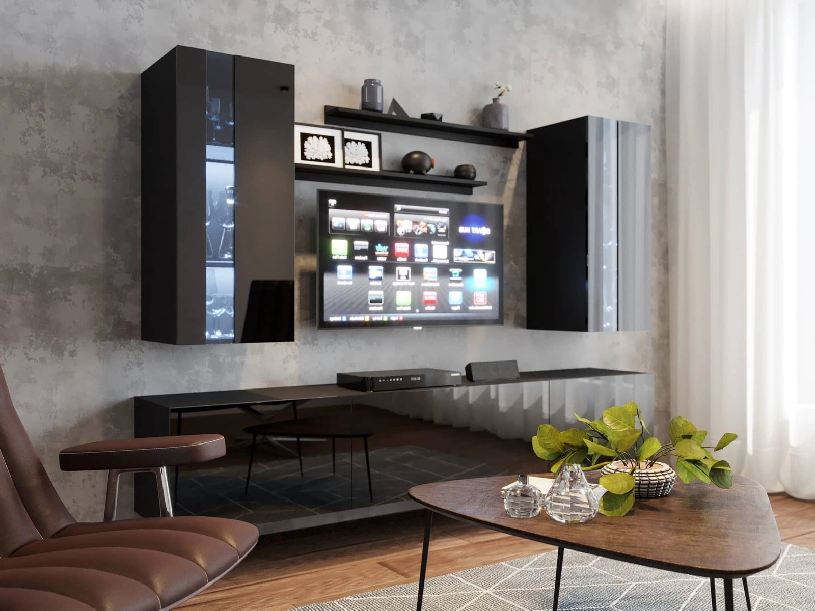 Prosklené vitríny umožňují vystavit dekorace do obývacího pokoje. Prostorná skříň RTV pojme veškeré příslušenství, stejně jako rtv vybavení nebo herní konzoli. Další výhoda skříně RTV je možnost volby způsobu jejího umístění. Skříň RTV lze zavěsit na stěnu. Díky volitelným nožičkám je skříň RTV velmi rychle se může stát stojícím kusem nábytku.