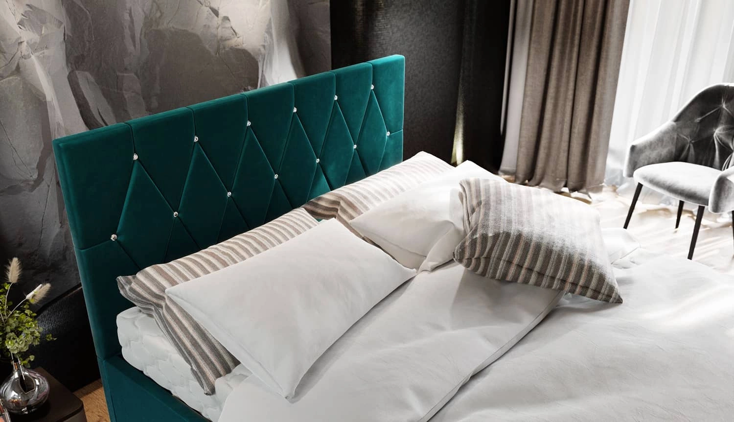 Čalouněná postel Tifton 160x200 lahvově zelená s úložným boxem v moderním stylu s výrazným čelem a nohama s povrchovou úpravou krystaly