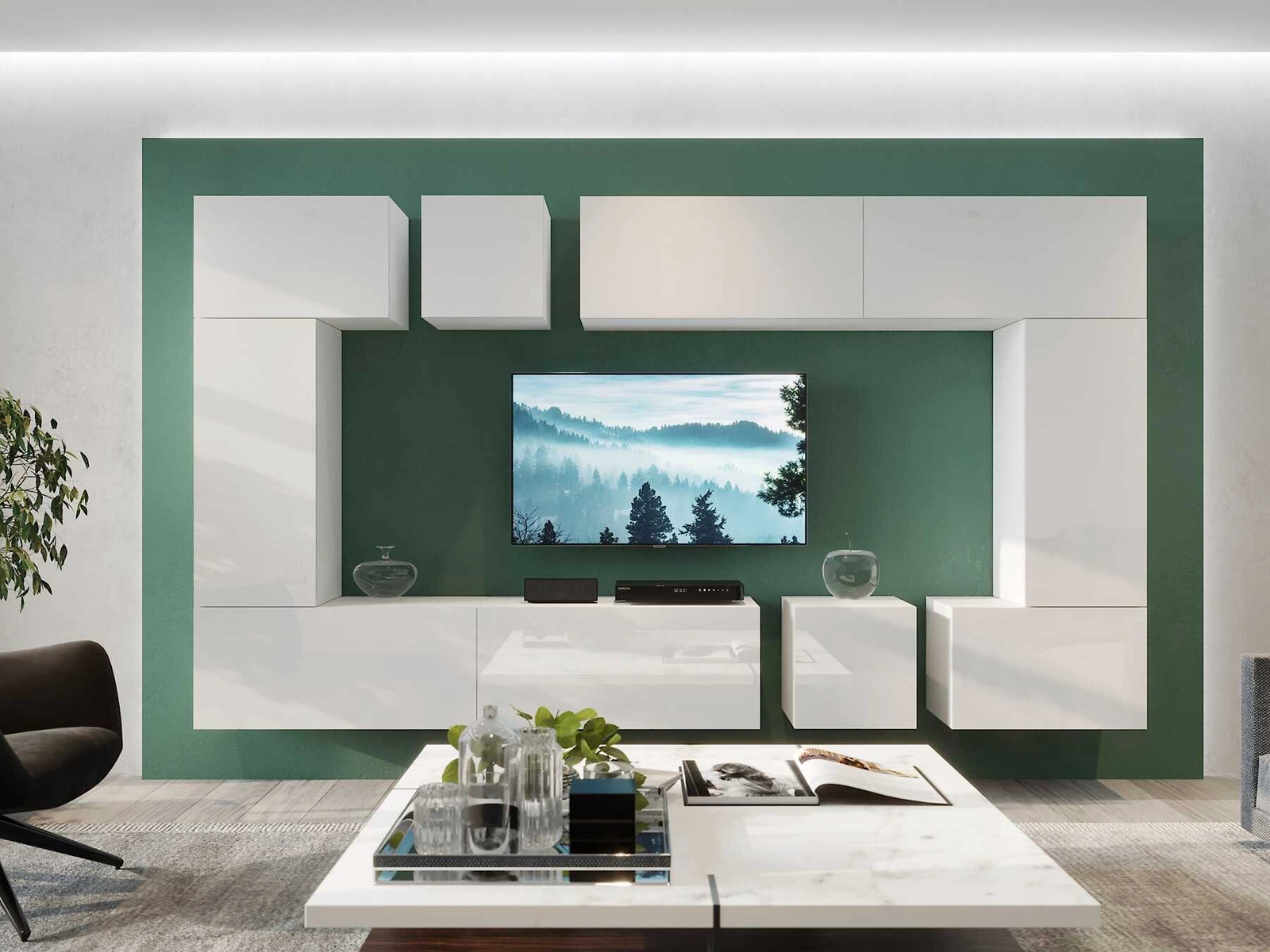 Dveře vertikálních skříněk nástěnné jednotky jsou univerzální a lze je namontovat po vpravo nebo po vlevo webové stránky. Horizontální dveře skříněk jsou uzamykatelné praktické klapky. Při otevírání nábytkových dvířek se bezúchytkový systém push-to-open. Kultovní bílá pevné látky se dobře kombinuje s ostatními barvami, což z nábytku Larisa dělá skvělý dokázat lze použít jako nástěnnou skříňku do obývacího pokoje nebo jako nástěnnou skříňku do obývacího pokoje.