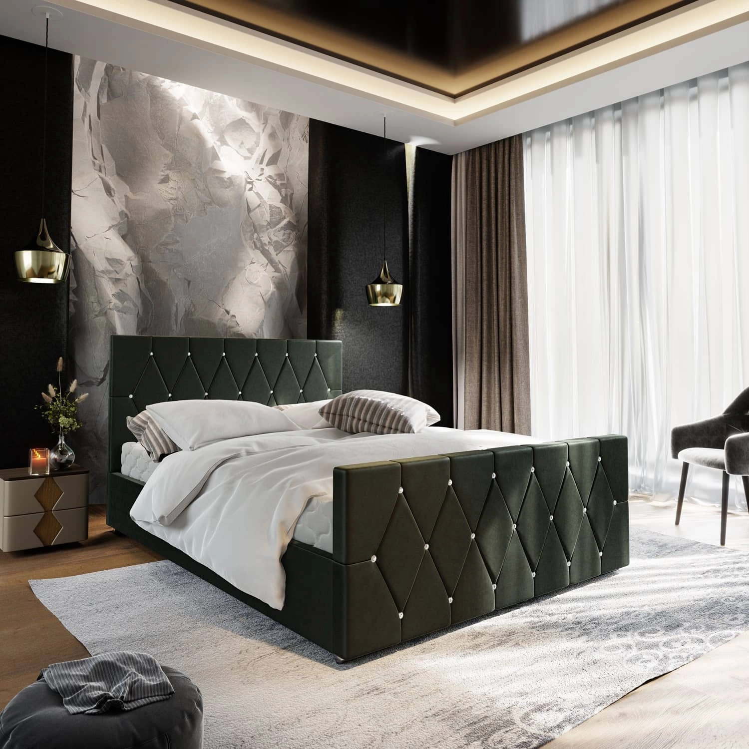 Lůžko z tkaniny plyš Ithaca 27 zaručuje maximální pohodlí a funkčnost pro každodenní relaxaci v ložnici. Tkanina je vyrobena s použitím snadné čištění a vykazuje vlastnosti omezení absorpce kapalin. Díky všem vlastnostem použité látky si čalouněná postel zachová svůj původní vzhled po dlouhou dobu. Konstrukce lůžka zajišťuje velkou stabilitu a pohodlí při používání. Konstrukce lůžka zajišťuje velkou stabilitu a pohodlí při používání. Rám postele je vyroben ze dřeva a nábytkové desky. Stylové prošívání a knoflíková úprava s krystaly na opěrce hlavy a opěrce nohou upoutá pozornost a dodá posteli zvláštní charakter.