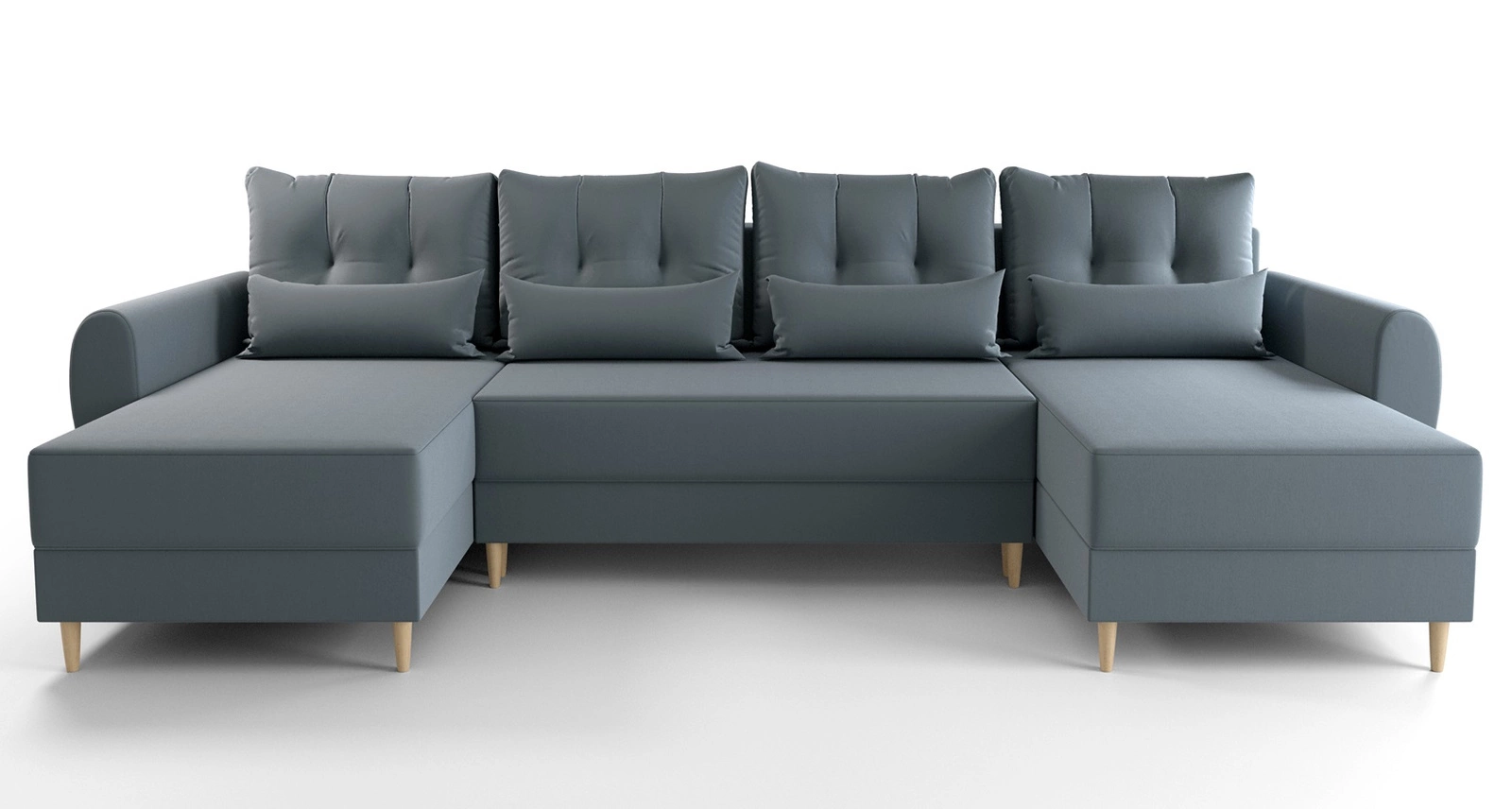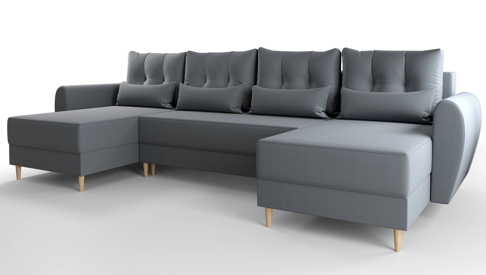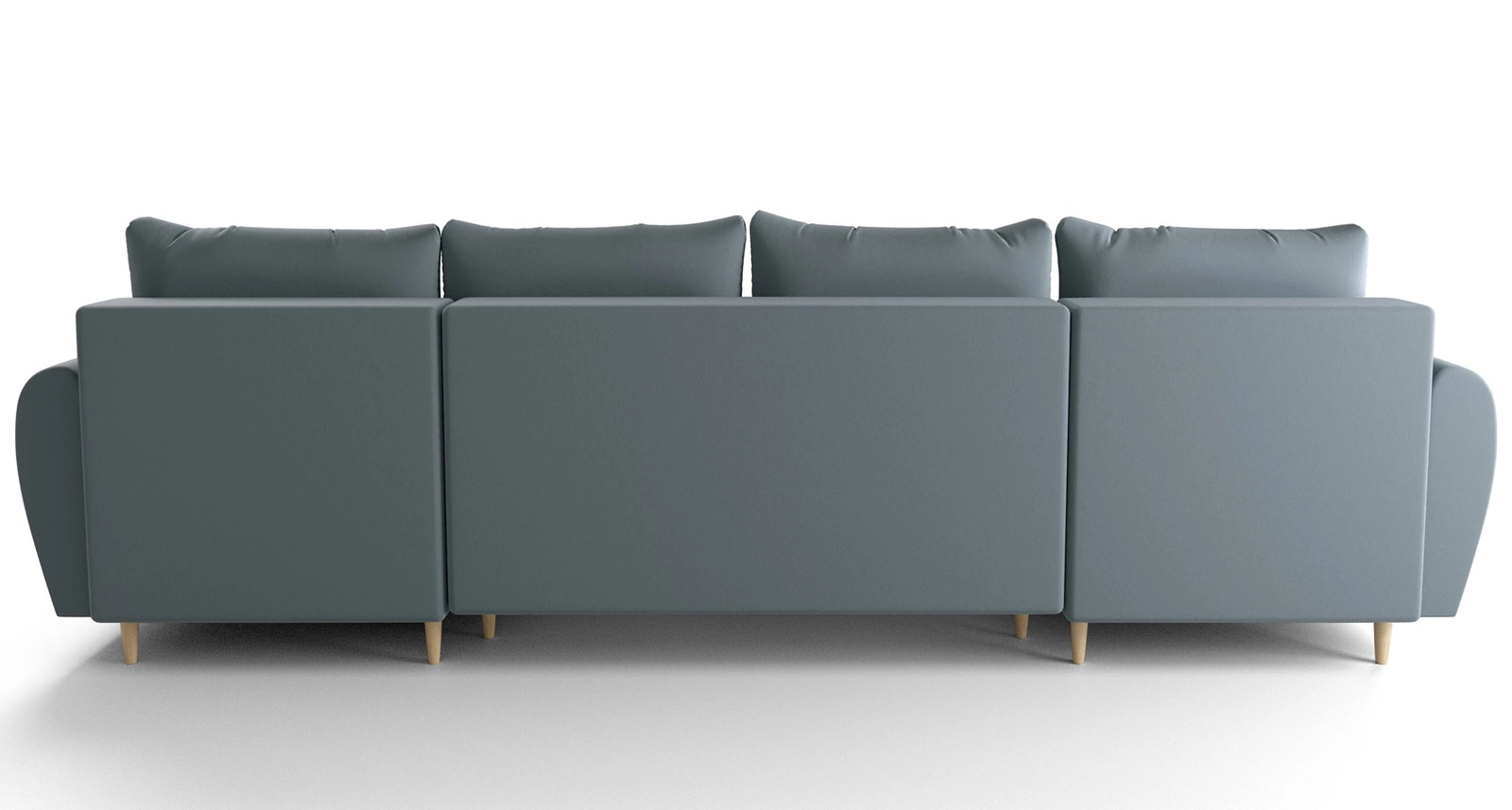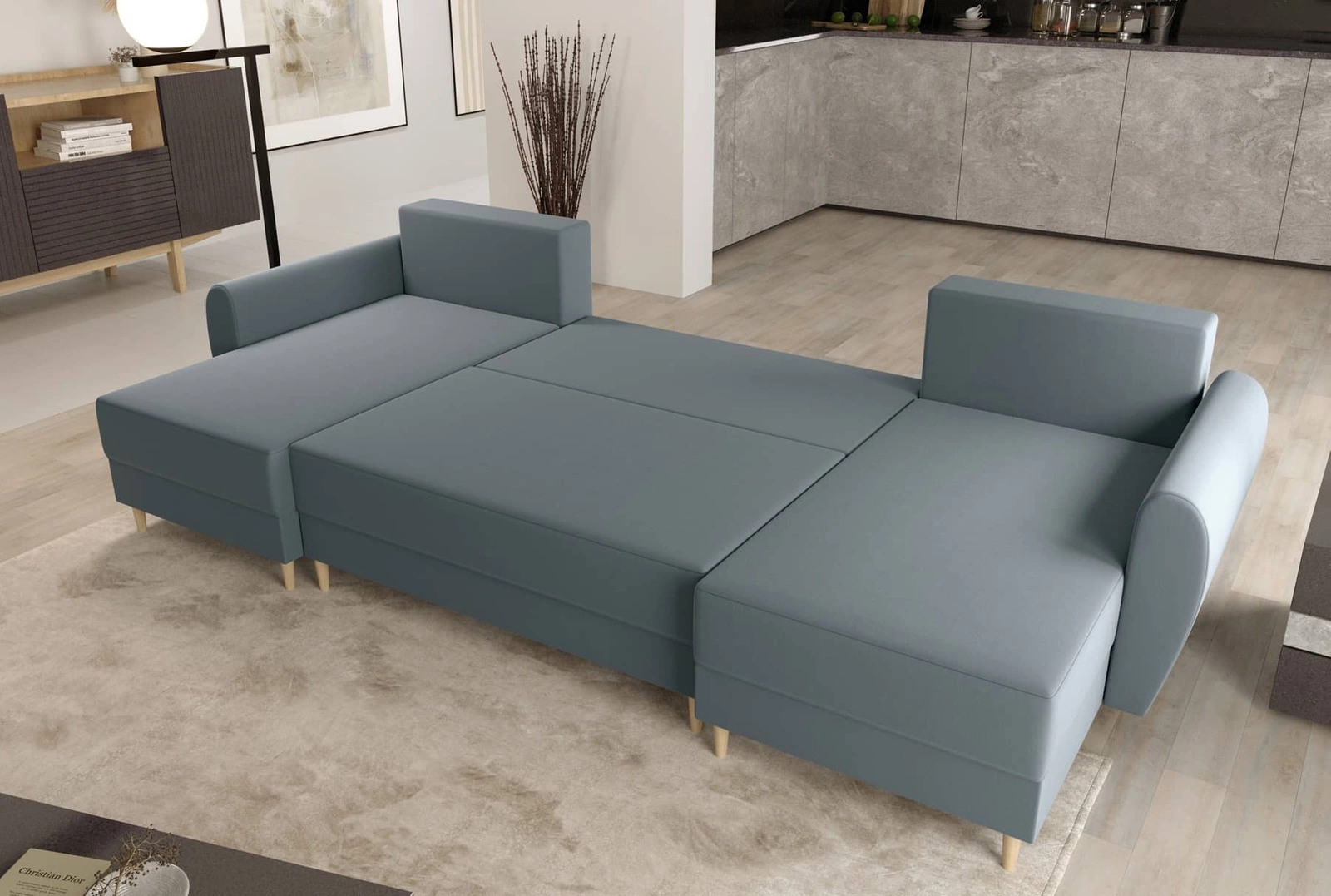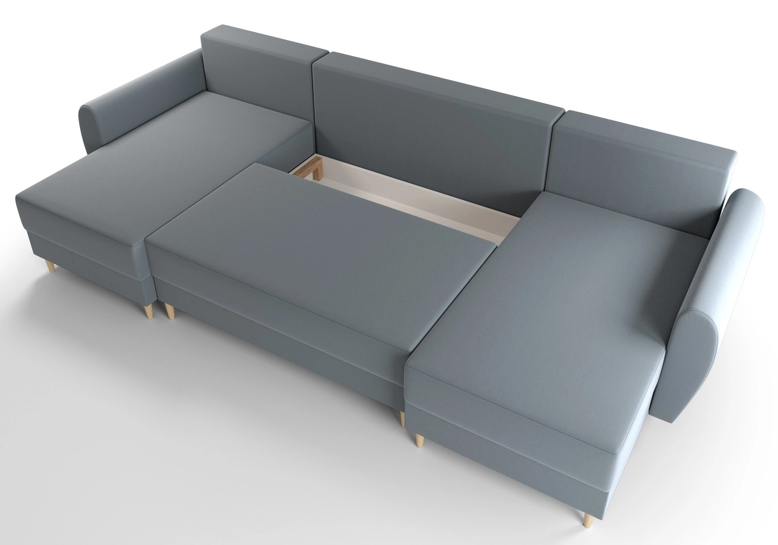 Rohová sedací souprava s funkcí spaní Rovigo U šedomodrá elegantní a pohodlná rohová sedací souprava ve skandinávském provedení s velkým prostorem na lůžkoviny