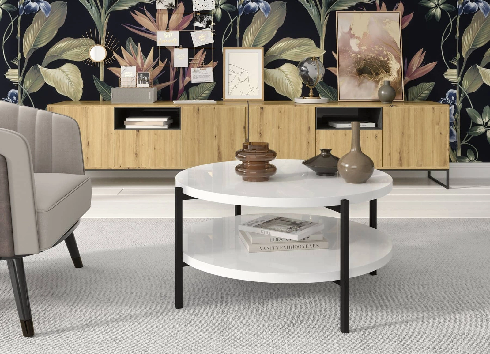 Konferenční stolek je vyroben z velký kulatý vršek odolný proti rozlití a polička pod horní deskou. Konferenční stolek zaručuje pohodlné a bezproblémové používání a trvanlivost celého nábytku po mnoho let používání. Bílé zbarvení v lesklém provedení kulaté konferenční stolky Sampi se dobře kombinují s jinými barvami, takže jsou ideální jako stoly do obývacího pokoje nebo do pokoje pro mladé. Moderní tabulky konferenční stolky lze s úspěchem použít jako malé lavičky.