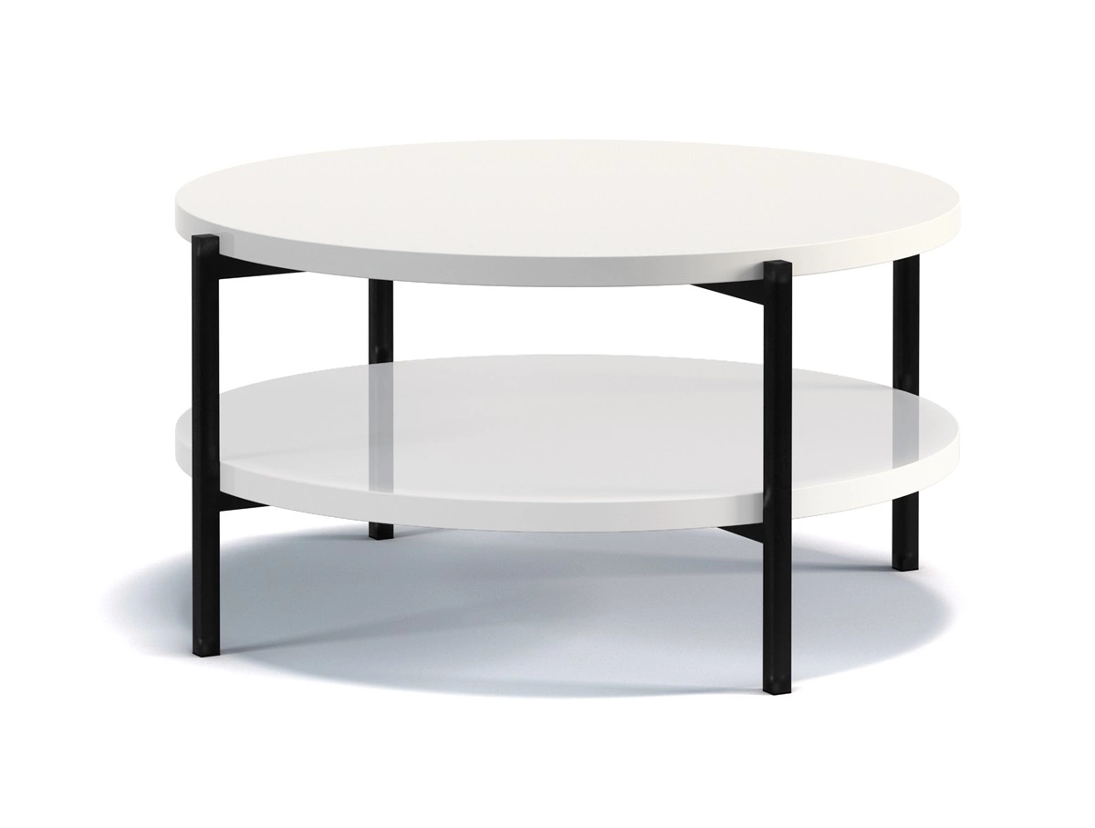 Kulatý konferenční stolek 84 cm Sampi bílý lesk s přídavnou policí světlý design kovová podnož ideální stolek pro jakékoli uspořádání