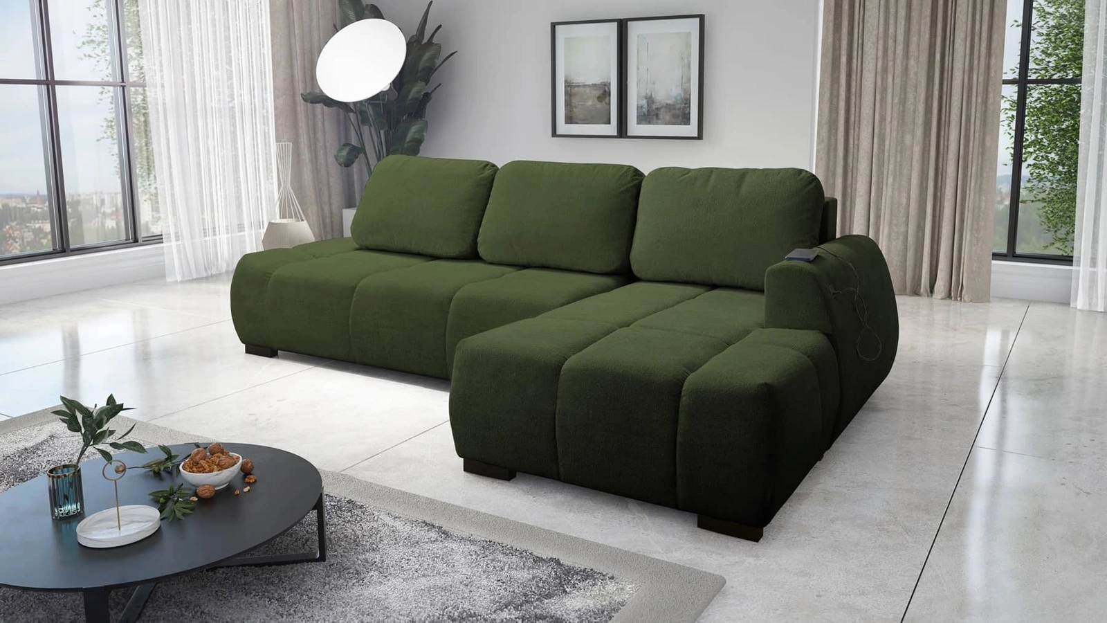 Rohová pohovka Gentle v olivově zelené barvě je zajímavě vypadající kus nábytku s elegantní povrchovou úpravou.