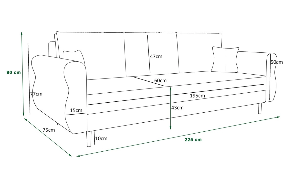 Díky svým optimálním rozměrům a široké funkčnosti je pohovka Wilkins ideální jako pohovka do obývacího pokoje nebo jako pohovka do obývacího pokoje. Pohovka bude ideální pro získejte také jako pohovka do pracovny nebo jako pohovka do kanceláře. Pohovky třímístný Wilkins dokonale zapadne do každého interiéru ve vašem oblíbeném stylu! Čalouněná záda pohovky umožňuje umístit nábytek do libovolné části místnosti. Šířka pohovky 225 cm, výška 90 cm a hloubka 75 cm. Spací plocha pohovky je 130x195 cm. Výška sedadla nábytku je 43 cm, výška opěradla je 47 cm. Polyuretanová pěna T30 je materiál, z něhož je vyrobeno sedadlo pohovky. Zádová opěrka polštáře zaručuje pohodlný odpočinek po dlouhém dni, který vy i vaši hosté oceníte, když si sednete na tuto jedinečnou pohovku!