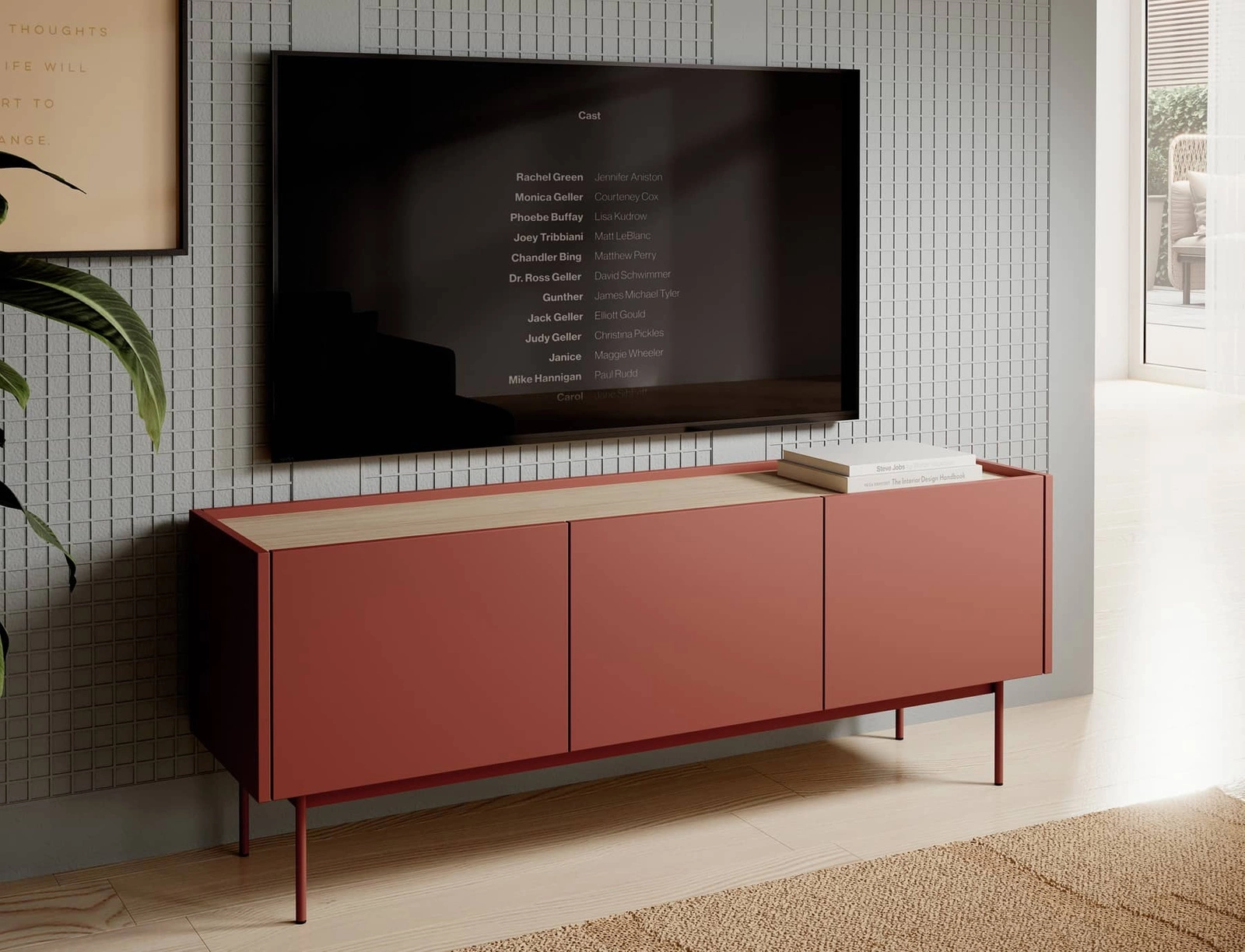 Skříň Vellore TV v cihlově červené barvě je návrh nábytku pro milovníky výrazných interiérů