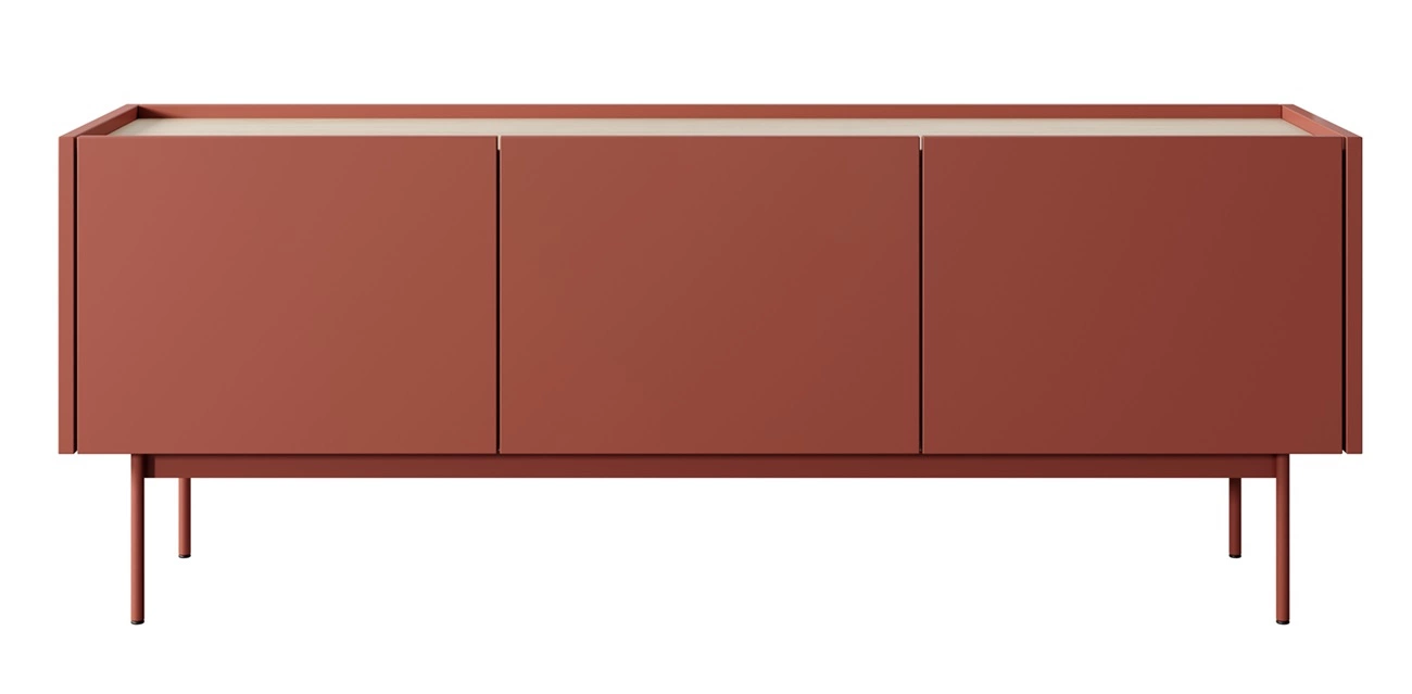 TV skříň Vellore 144 cm cihlová originální design bezúchytková čela kovové nohy v barvě čel skříně snížená horní část