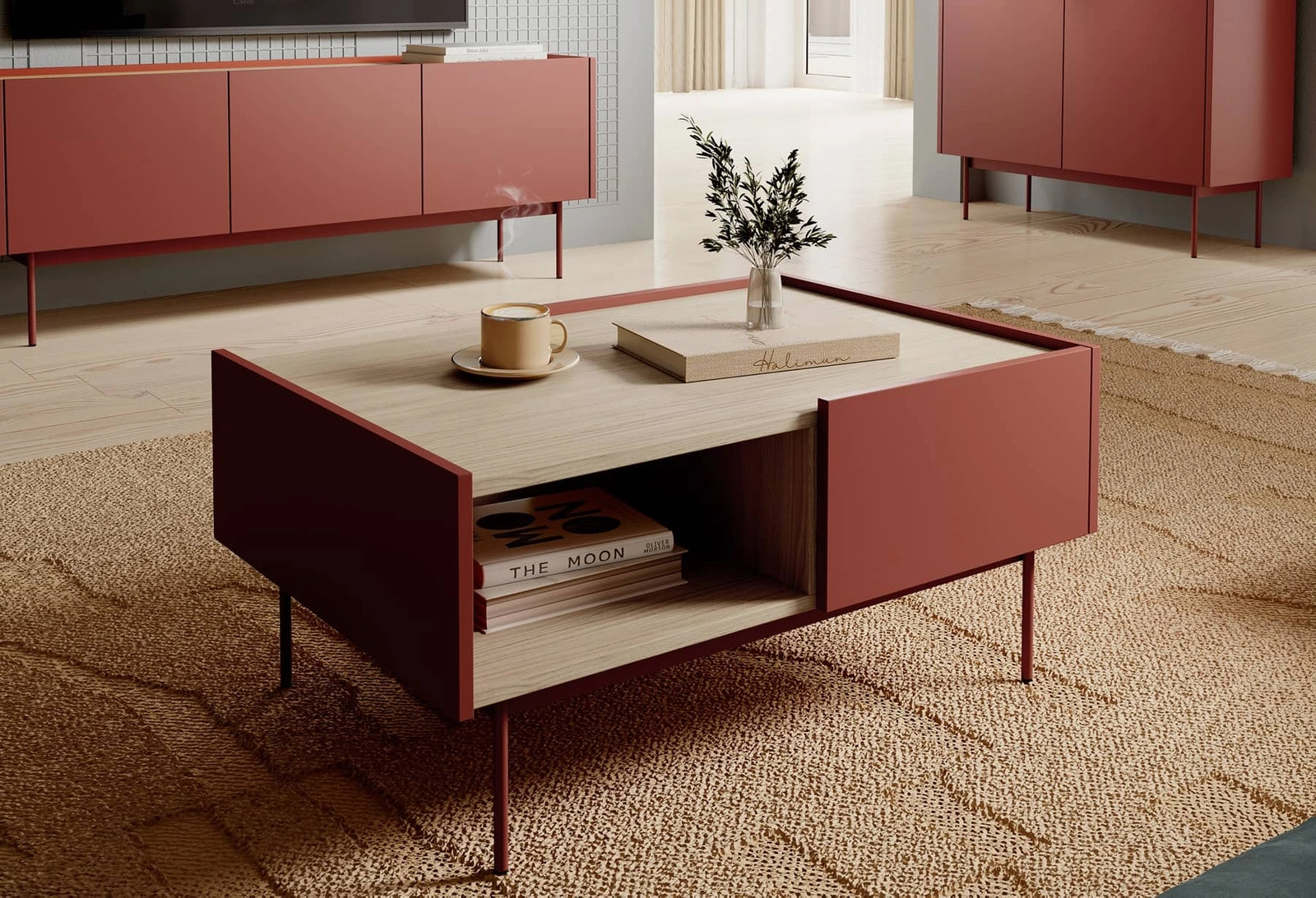 Konferenční stolek Vellore v cihlově červené barvě je návrh nábytku pro milovníky výrazných interiérů.