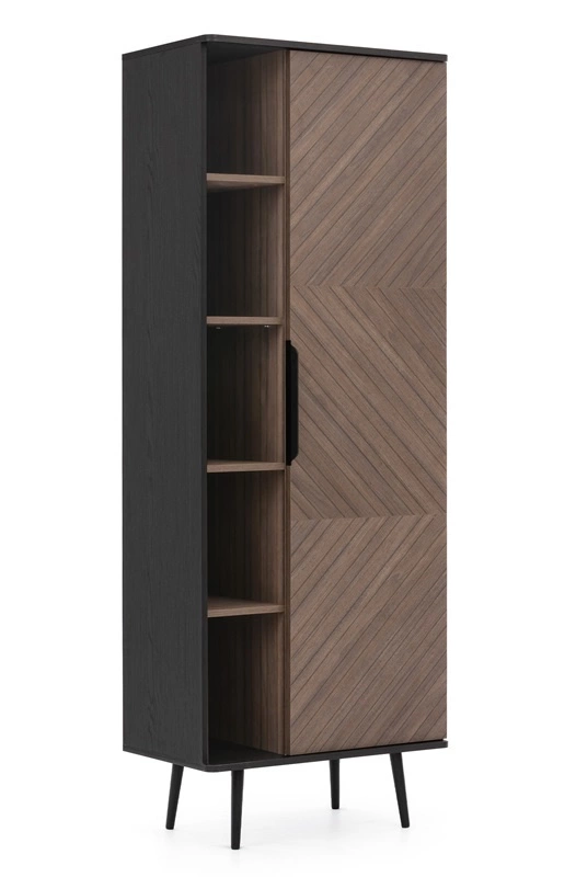 Stojan je vyroben z otevřené části a 1 dveře. Standardní výbava zahrnuje závěsy se systémem měkkého zavírání. Použitý systém zvyšuje komfort a bezpečnost nábytku. Teplé dřevěné hnědé kapitánské paluby se dokonale hodí pro sofistikovaná aranžmá, takže knihovny Tullio jsou ideální jako knihovny do obývacího pokoje, kancelářské knihovny nebo knihovny do obývacího pokoje.