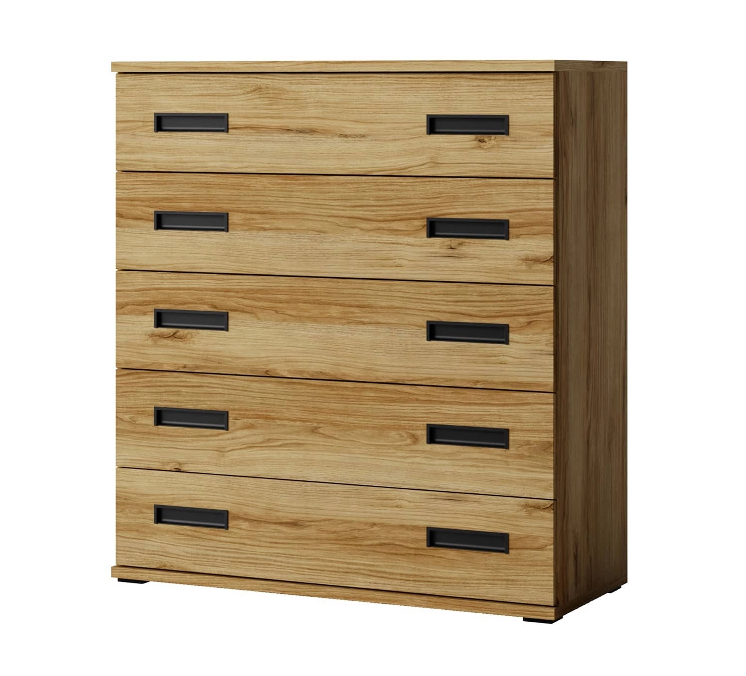 Nábytek je vyroben z 5 zásuvky výsuv na válečkových kluzácích. Čela komody jsou doplněna úchytkami v barevném provedení černá. Komoda je vyrobena z vysoce kvalitní laminované desky, který je odolný vůči vnějším vlivům, jako jsou otlaky, nárazy a nešťastné škrábance.