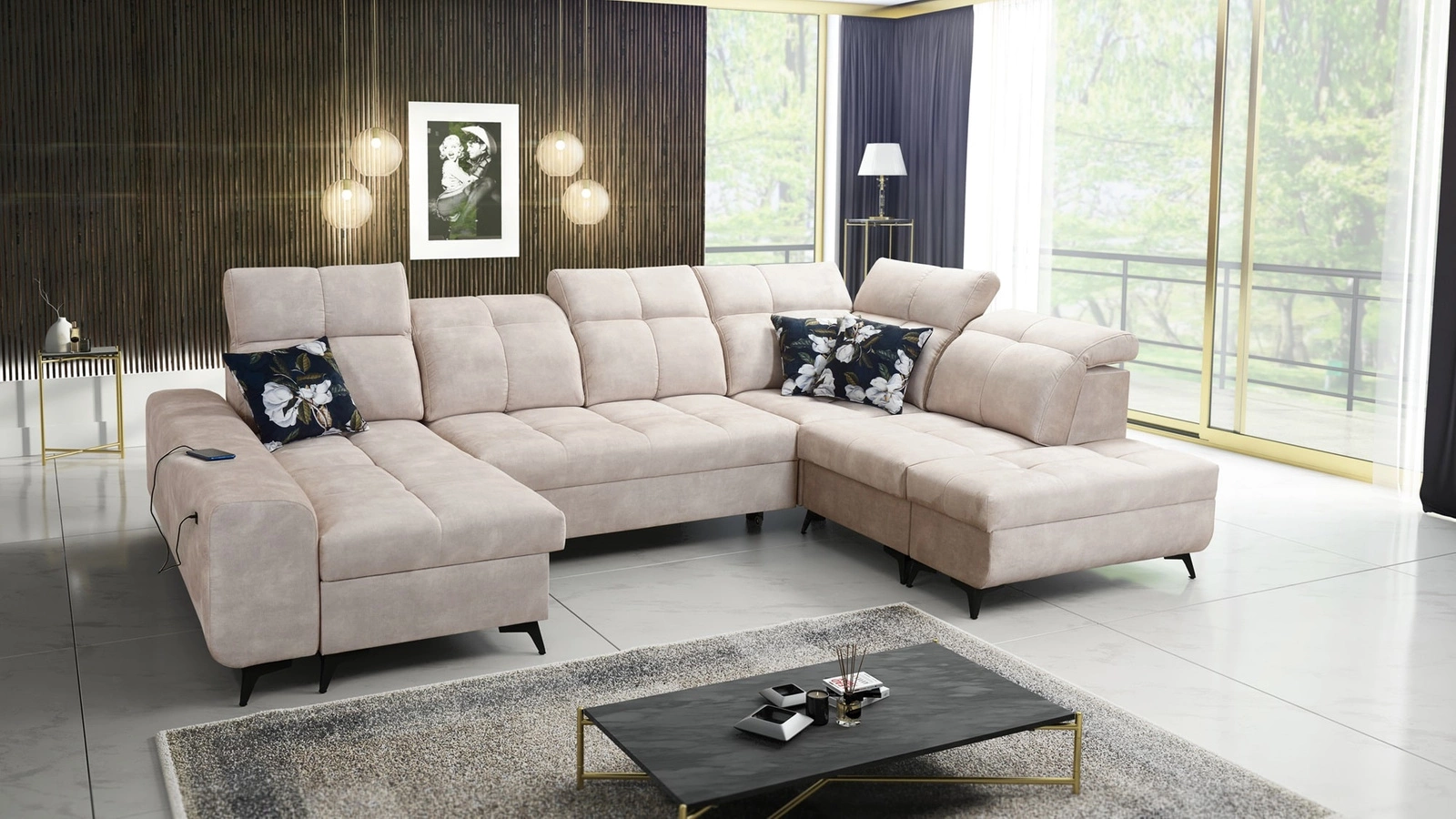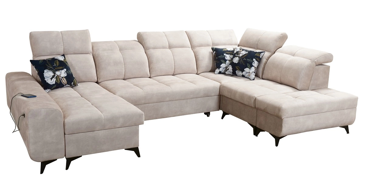 Mezi doplňky tohoto nábytku, které ocení všichni uživatelé, patří až šest nastavitelných opěrek hlavy, tři nádoby na lůžkoviny a nabíjecí zásuvka USB v boční části rohové skříně.