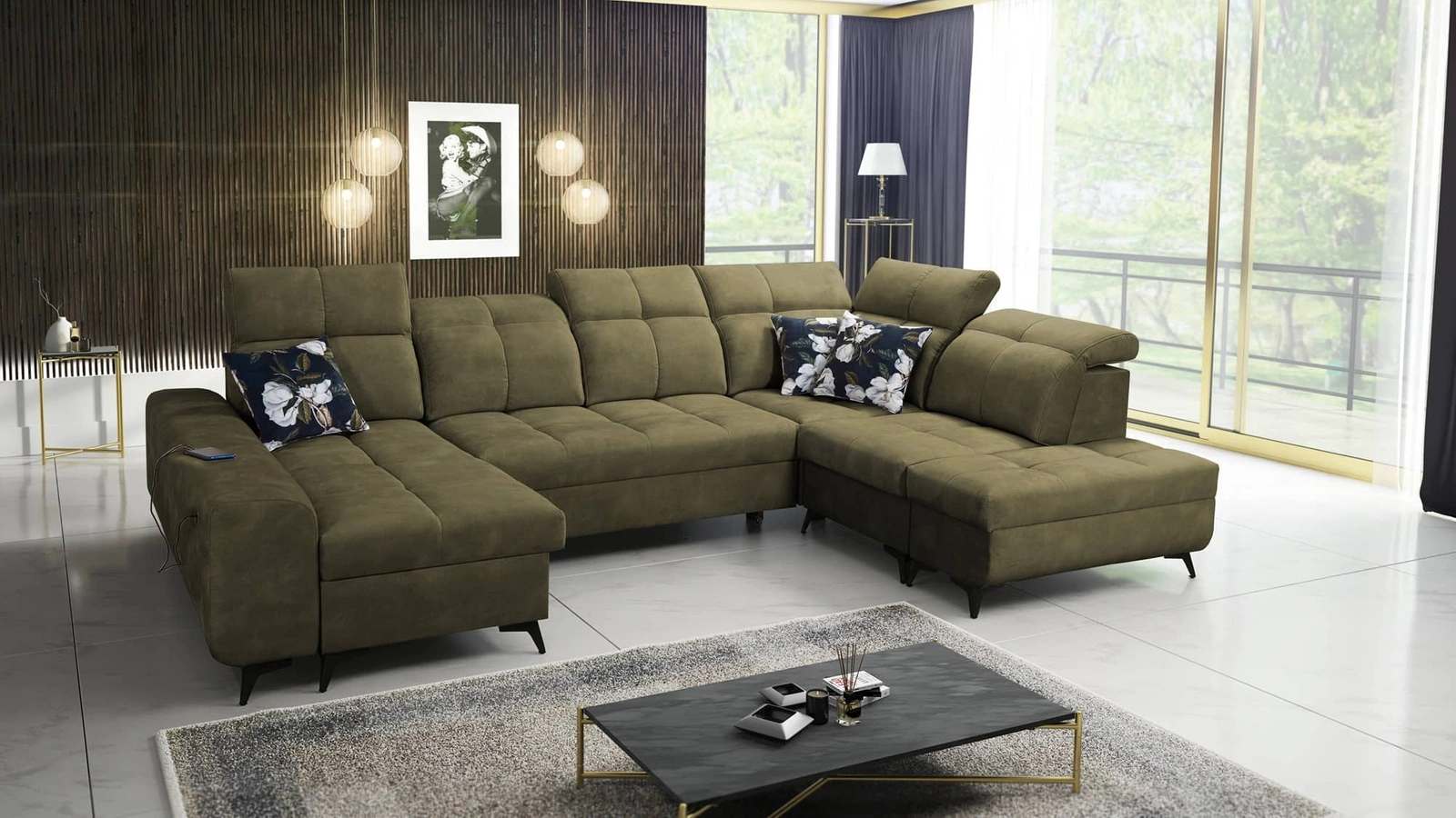 Mezi doplňky tohoto nábytku, které ocení všichni uživatelé, patří až šest nastavitelných opěrek hlavy, tři nádoby na lůžkoviny a nabíjecí zásuvka USB v boční části rohové skříně.