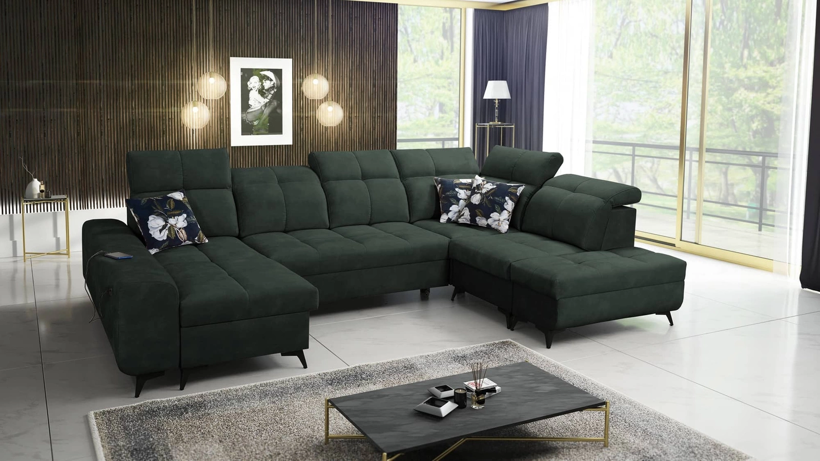 Rohová pohovka s funkcí spaní Buffalo VI zelená levá Funkční a stylová rohová pohovka se třemi nádobami na lůžkoviny