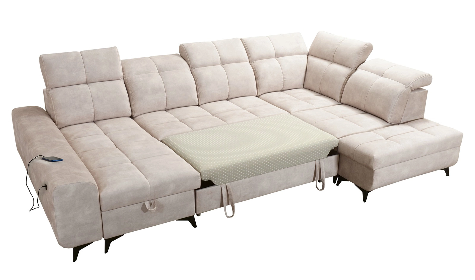 Mezi doplňky tohoto nábytku, které ocení všichni uživatelé, patří až šest nastavitelných opěrek hlavy, tři nádoby na lůžkoviny a nabíjecí zásuvka USB v boční části rohové skříně.