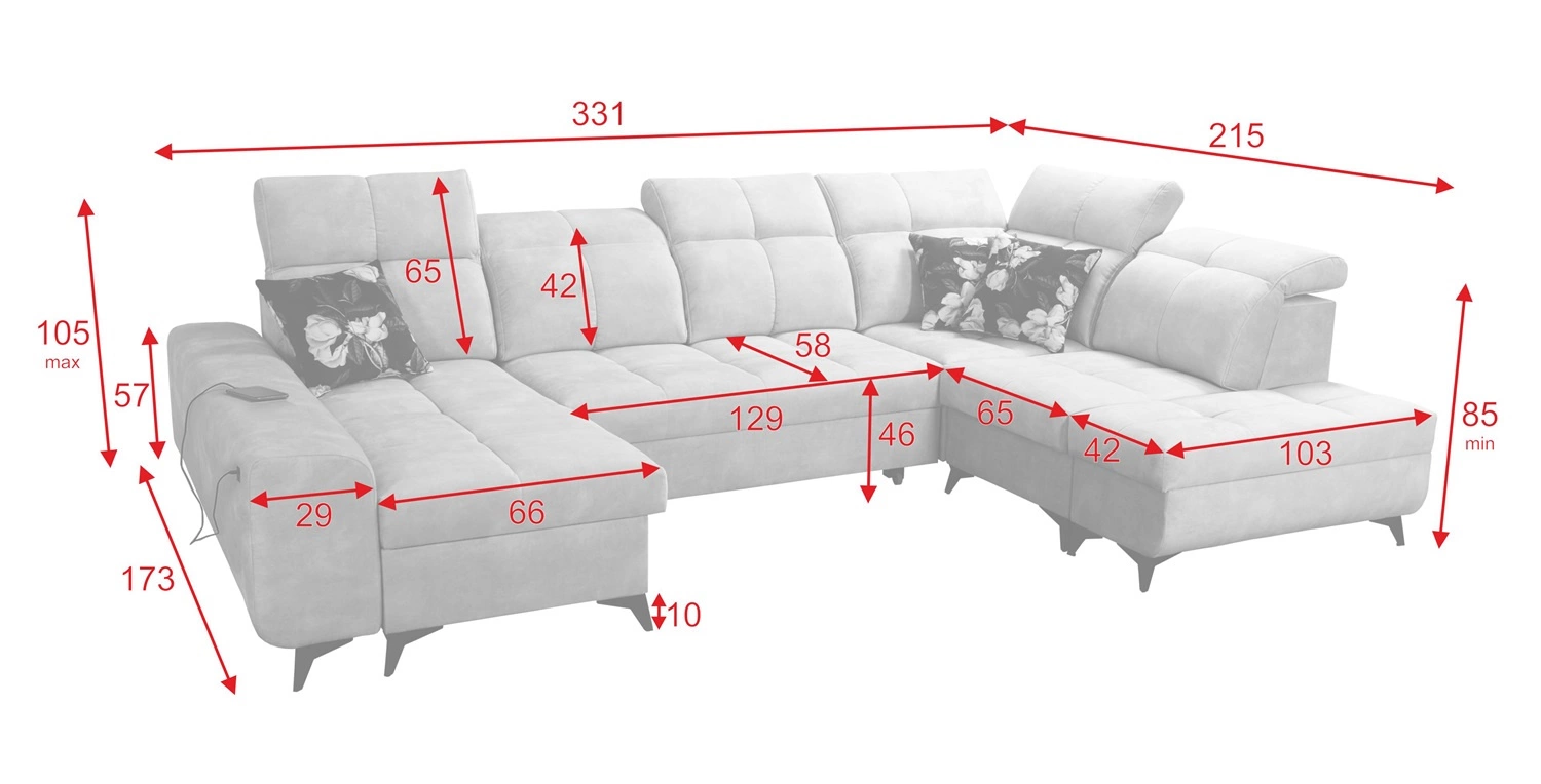 Rozměry nábytku umožňují vyplnění prostoru v prostorném obývacím pokoji nebo zasedací místnosti. Šířka rohu 331 cm, maximální výška 105 cm a hloubka 215 cm. Spací plocha rohové jednotky je 129x255 cm. Výška sedadla nábytku je 46 cm a maximální výška opěradla je 65 cm. Vlnité pružiny a polyuretanová pěna T30 je materiál, z něhož je vyrobeno sedadlo rohu. Pevné opěradlo s nastavitelnými opěrkami hlavy umožní snadné adaptace úhel opěrek hlavy podle vašich preferencí a zaručí vám pohodlný odpočinek po dlouhém dni, který oceníte vy, vaši blízcí i hosté, kteří se na tuto jedinečnou rohovou pohovku posadí.