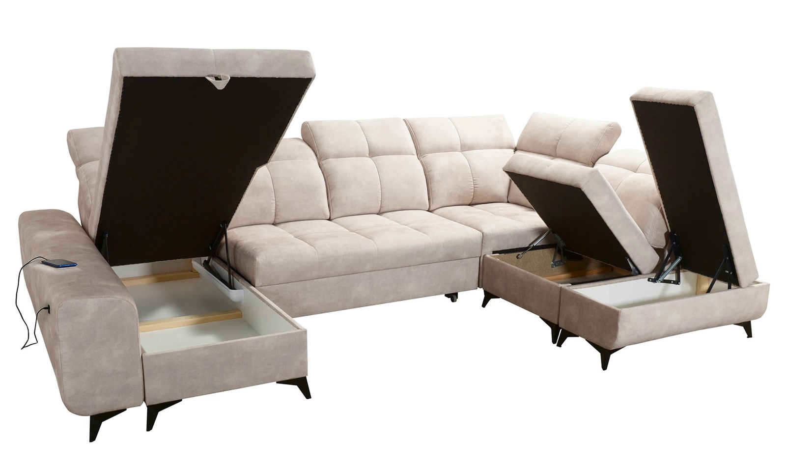 Mezi doplňky tohoto nábytku, které ocení všichni uživatelé, patří až šest nastavitelných opěrek hlavy, tři nádoby na lůžkoviny a nabíjecí zásuvka USB v boční části rohové skříně.