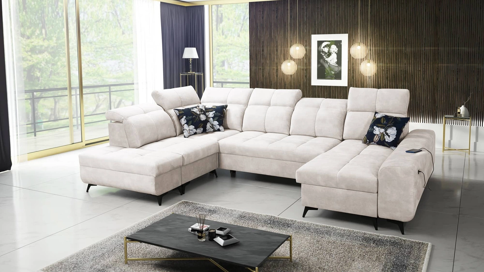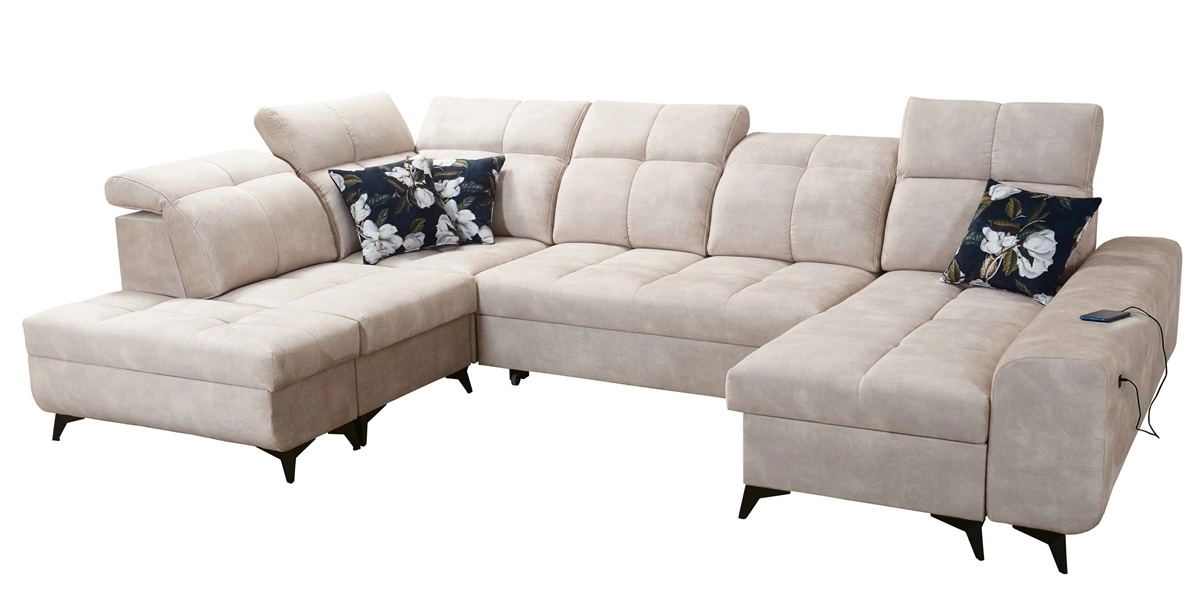 Mezi doplňky tohoto nábytku, které ocení všichni uživatelé, patří až šest nastavitelných opěrek hlavy, tři nádoby na lůžkoviny a nabíjecí zásuvka USB v boční části rohové skříně.