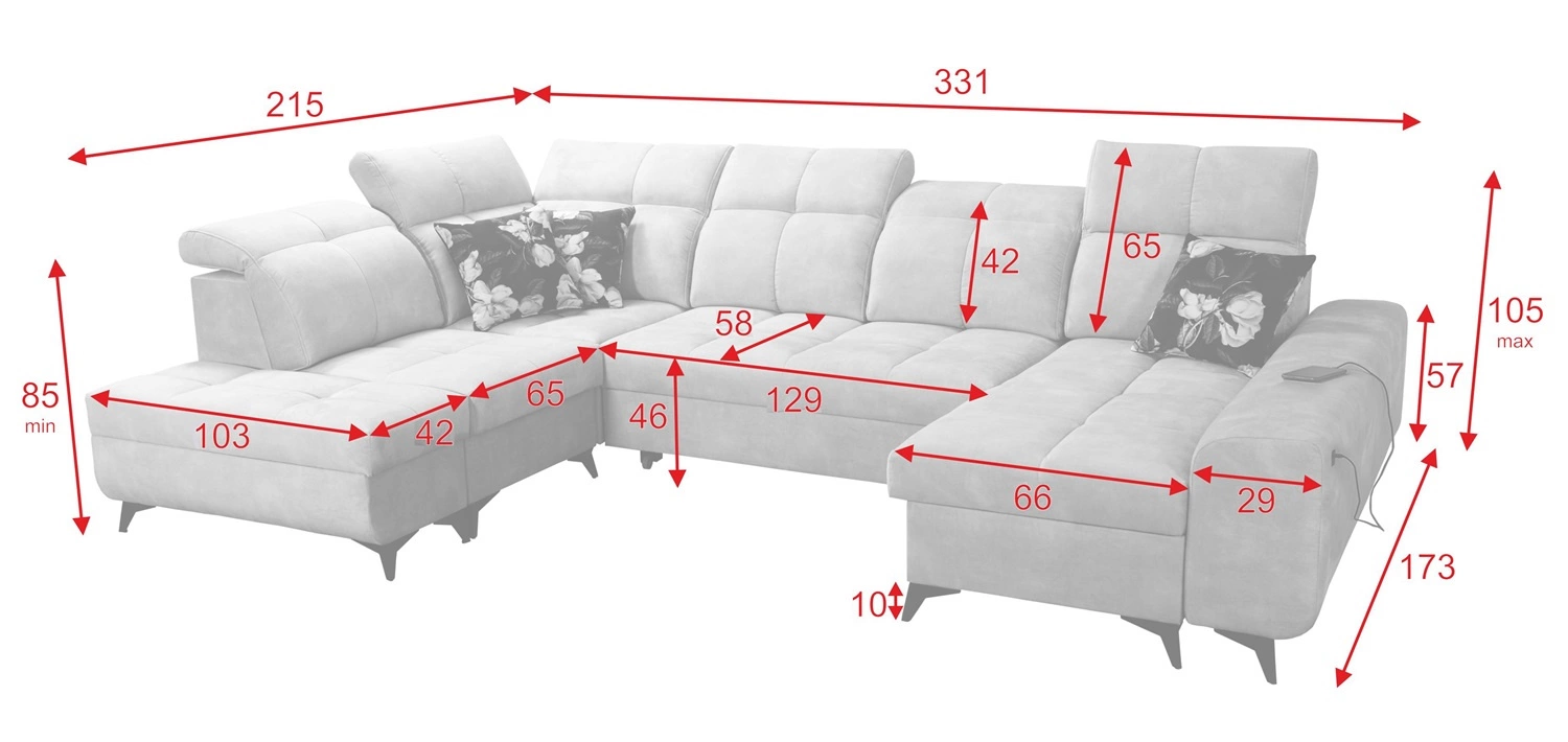 Rozměry nábytku umožňují vyplnění prostoru v prostorném obývacím pokoji nebo zasedací místnosti. Šířka rohu 331 cm, maximální výška 105 cm a hloubka 215 cm. Spací plocha rohové jednotky je 129x255 cm. Výška sedadla nábytku je 46 cm a maximální výška opěradla je 65 cm. Vlnité pružiny a polyuretanová pěna T30 je materiál, z něhož je vyrobeno sedadlo rohu. Pevné opěradlo s nastavitelnými opěrkami hlavy umožní snadné adaptace úhel opěrek hlavy podle vašich preferencí a zaručí vám pohodlný odpočinek po dlouhém dni, který oceníte vy, vaši blízcí i hosté, kteří se na tuto jedinečnou rohovou pohovku posadí.