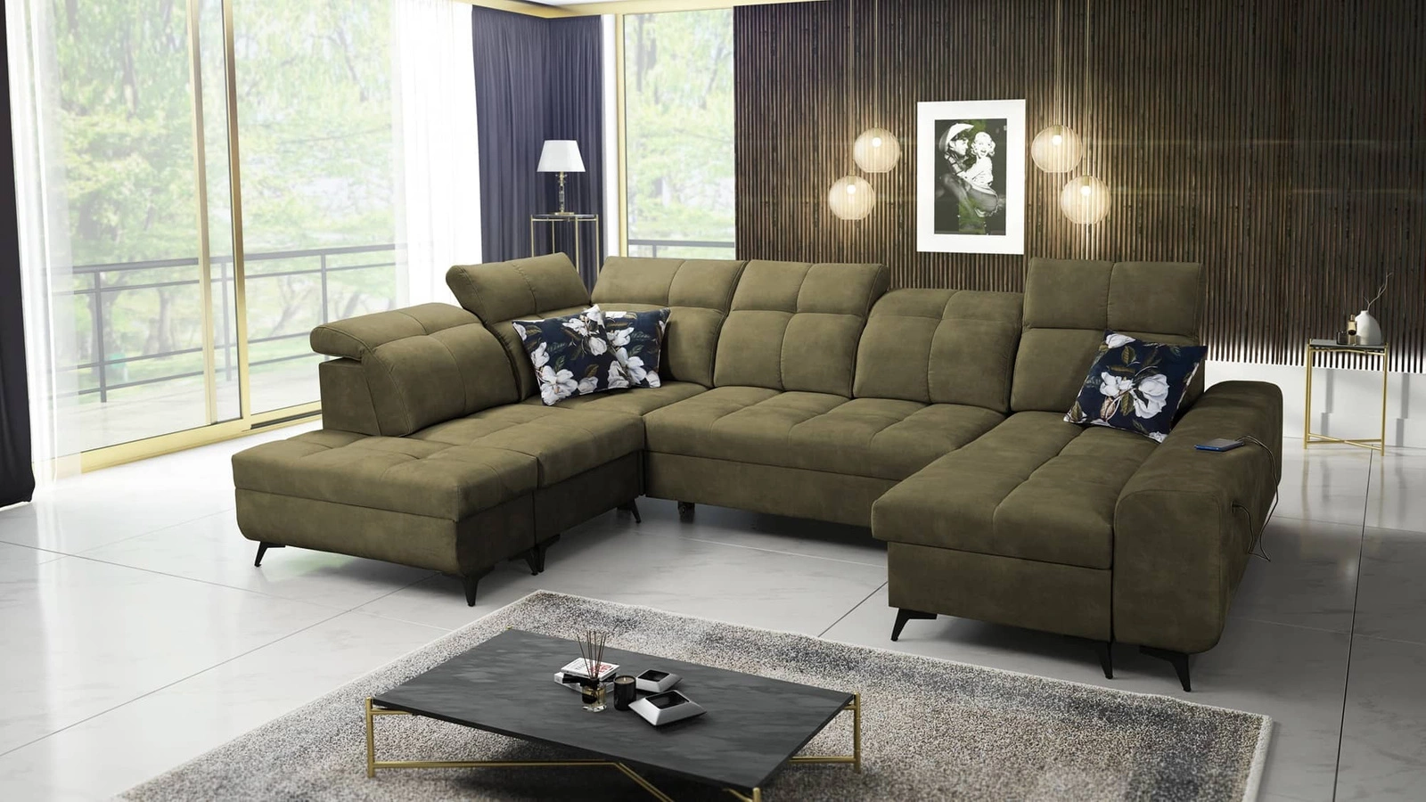 Rohová pohovka Buffalo VI v olivově zelené barvě s nastavitelnými opěrkami hlavy je zajímavě vypadajícím kusem nábytku s elegantní povrchovou úpravou.