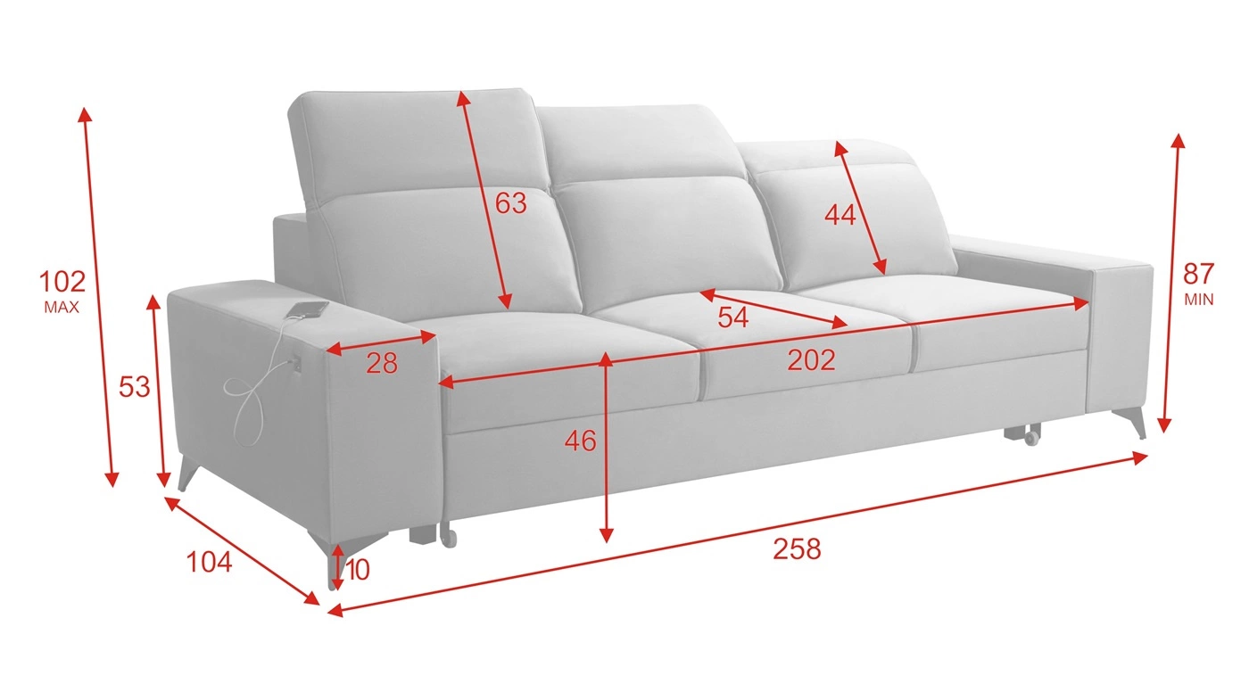 Rozměry nábytku jsou optimální. Šířka pohovky 258 cm, maximální výška 102 cm a hloubka 104 cm. Spací plocha pohovky je 124x195 cm. Výška sedadla nábytku je 46 cm a maximální výška opěradla je 63 cm.