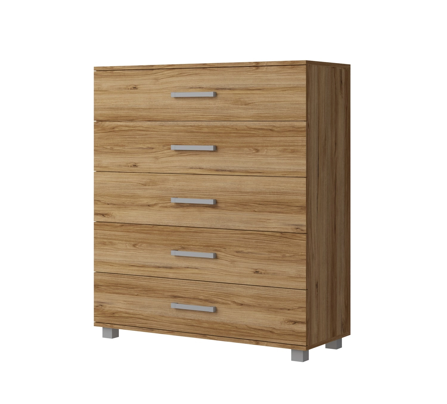 Nábytek je vyroben z 5 zásuvky výsuv na válečkových kluzácích. Komoda je vyrobena z vysoce kvalitní laminované desky, který je odolný vůči vnějším vlivům, jako jsou otlaky, nárazy a nešťastné škrábance. Stylovou povrchovou úpravou čel komody jsou následující prvky stříbro rukojeti, které kromě své primární funkce poskytují mimořádně vkusný vzhled.