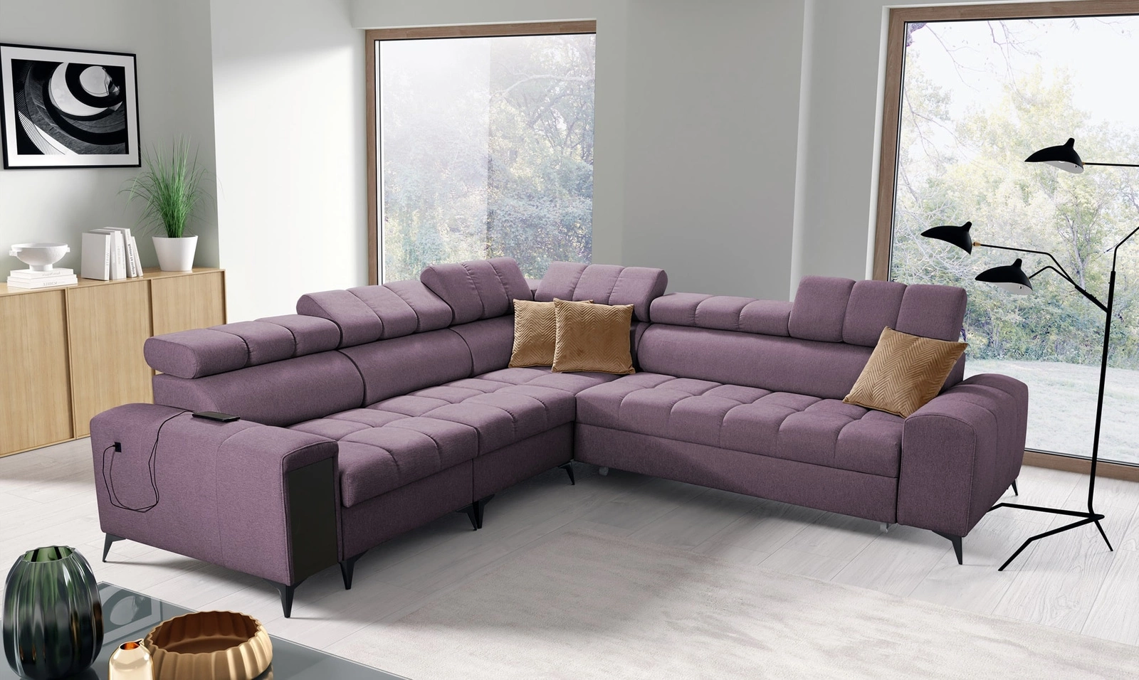 Rohová pohovka Bolmso III ve fialové barvě s nastavitelnými opěrkami hlavy je nádherný kus nábytku se zárukou nejvyššího pohodlí a funkčnosti.