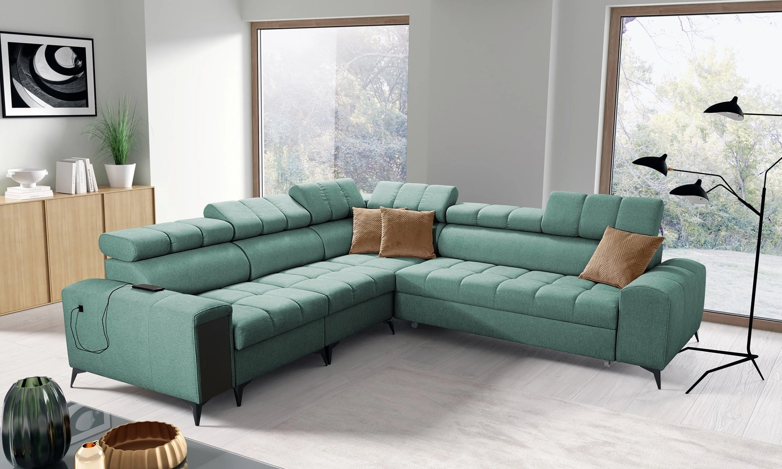 Rohová pohovka Bolmso III v mátové barvě s nastavitelnými opěrkami hlavy je nádherný kus nábytku se zárukou nejvyššího pohodlí a funkčnosti.