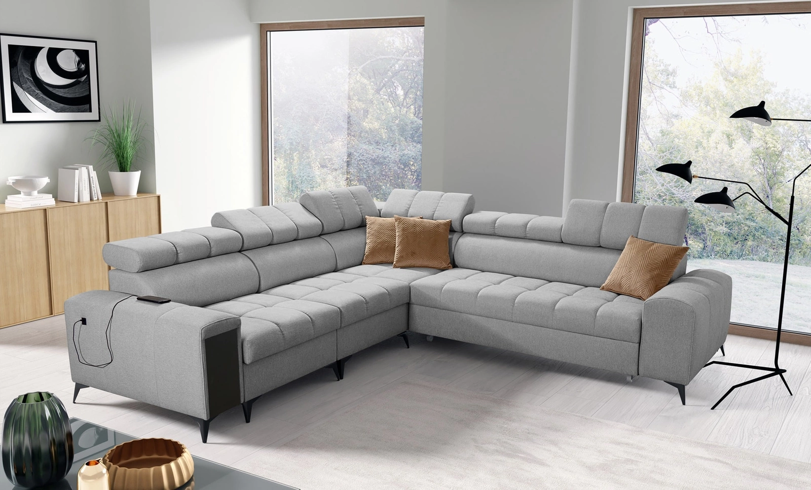 Mezi další funkce tohoto nábytku, které ocení všichni uživatelé, patří kontejner na lůžkoviny, funkce spaní, nabíjecí zásuvka USB v boční části rohové skříně a zásuvka s plnovýsuvným systémem v boční části nábytku.