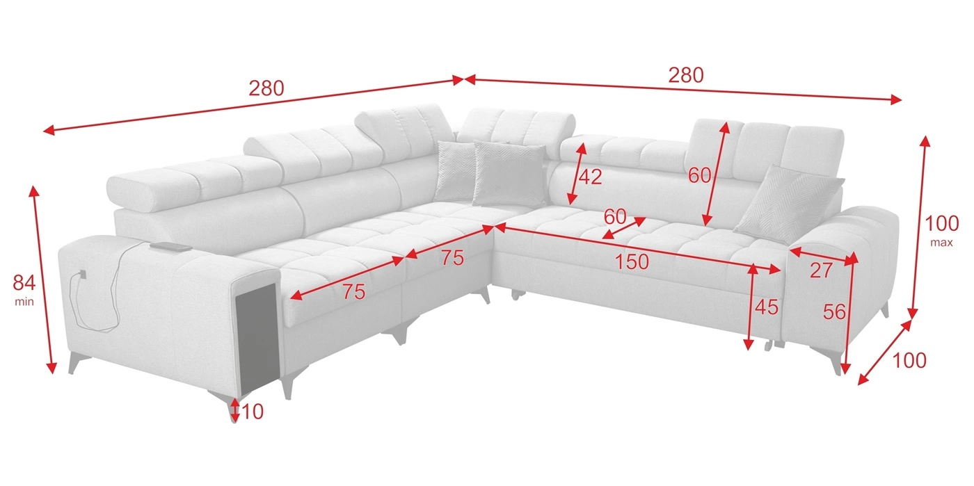 Rozměry nábytku jsou optimální. Šířka rohu 280 cm, maximální výška 100 cm a hloubka 280 cm. Spací plocha rohové jednotky je 127x210 cm. Výška sedadla nábytku je 45 cm a maximální výška opěradla je 60 cm. Vlnité pružiny a polyuretanová pěna T30 je materiál, z něhož je vyrobeno sedadlo rohu. Pevné opěradlo s nastavitelnými opěrkami hlavy zaručuje pohodlný odpočinek po dlouhém dni, který oceníte vy, vaši blízcí i hosté, kteří si na tuto jedinečnou rohovou sedačku sednou!