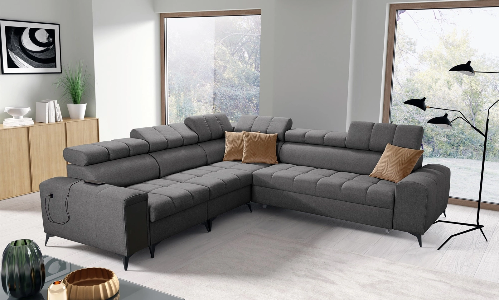 Mezi další funkce tohoto nábytku, které ocení všichni uživatelé, patří kontejner na lůžkoviny, funkce spaní, nabíjecí zásuvka USB v boční části rohové skříně a zásuvka s plnovýsuvným systémem v boční části nábytku.