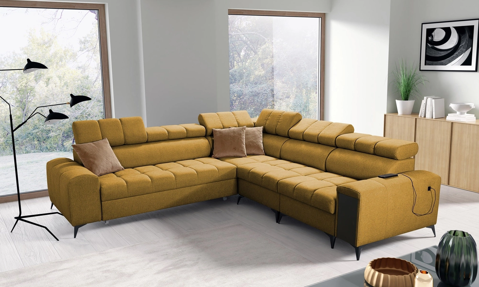 Rohová pohovka Bolmso III v hořčici s nastavitelnými opěrkami hlavy je nádherný kus nábytku se zárukou nejvyššího pohodlí a funkčnosti.