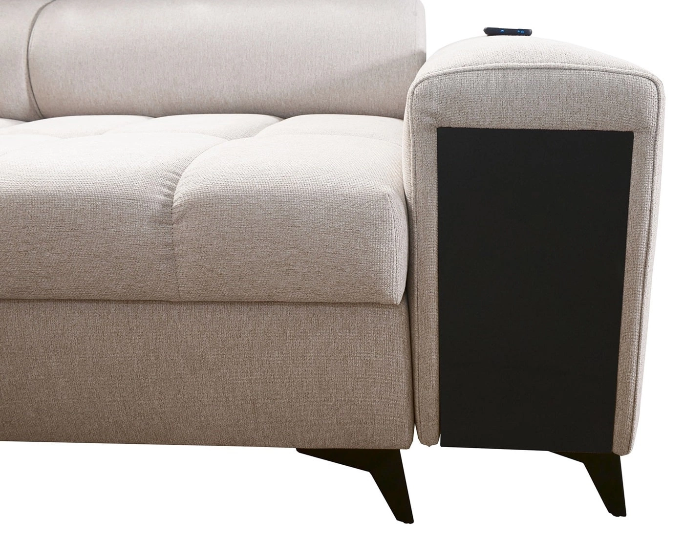 Mezi další funkce tohoto nábytku, které ocení všichni uživatelé, patří kontejner na lůžkoviny, funkce spaní, nabíjecí zásuvka USB v boční části rohové skříně a zásuvka s plnovýsuvným systémem v boční části nábytku.