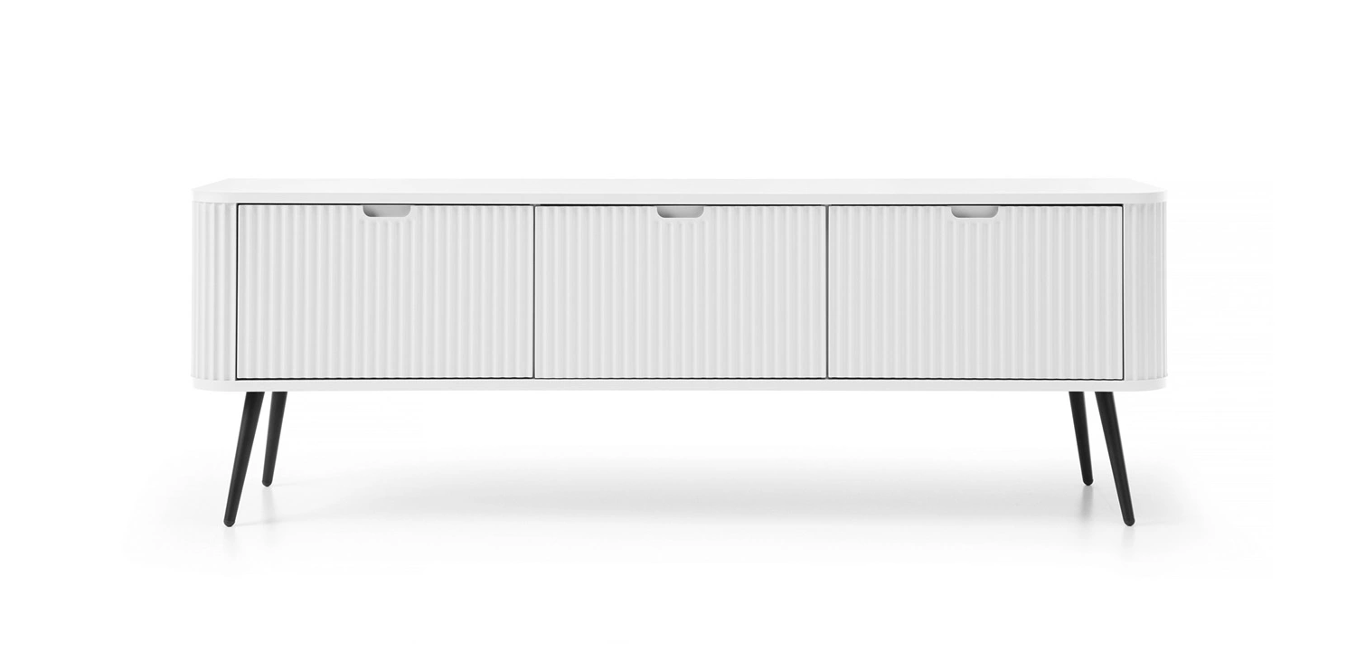 Skříňka RTV Zoya v bílé barvě je moderní kus nábytku, který překvapí svým tvarem a estetikou.